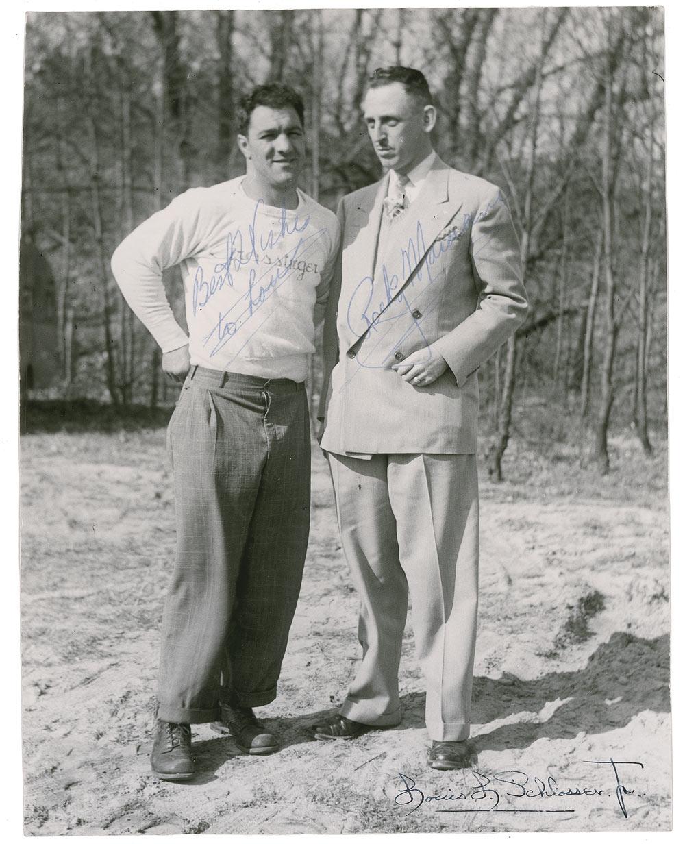 Vintage pearl-finish 7.5 x 9.5 photo of Marciano posing with Detroit police officer, and noted area collector, Louis Schlosser, at Marciano‘s training camp in Holland, Michigan, signed and inscribed in blue ink “Best wishes to Lou, Rocky Marciano.” Photo is also signed in fountain pen by Schlosser. Affixed to the reverse is a newspaper clipping featuring the same image of the two posing together, with the caption noting the Schlosser visited Marciano at his training camp and stayed for two days, as well as a new column written by Schlosser about Marciano. In fine condition, with lighly trimmed edges, and a bit of light contrast to Marciano’s signature, but still completely legible.