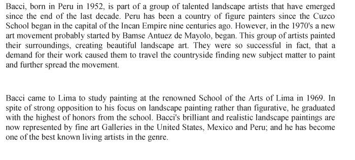 Peruvian artist Bocci created this gorgeous 24x48" original oil painting of the Rocky Mountains using photographs sent to him from in and around Aspen, Colorado . It is framed in a distressed brown molding with a linen liner and gold wood filet . Approx ship weight 33lbs.