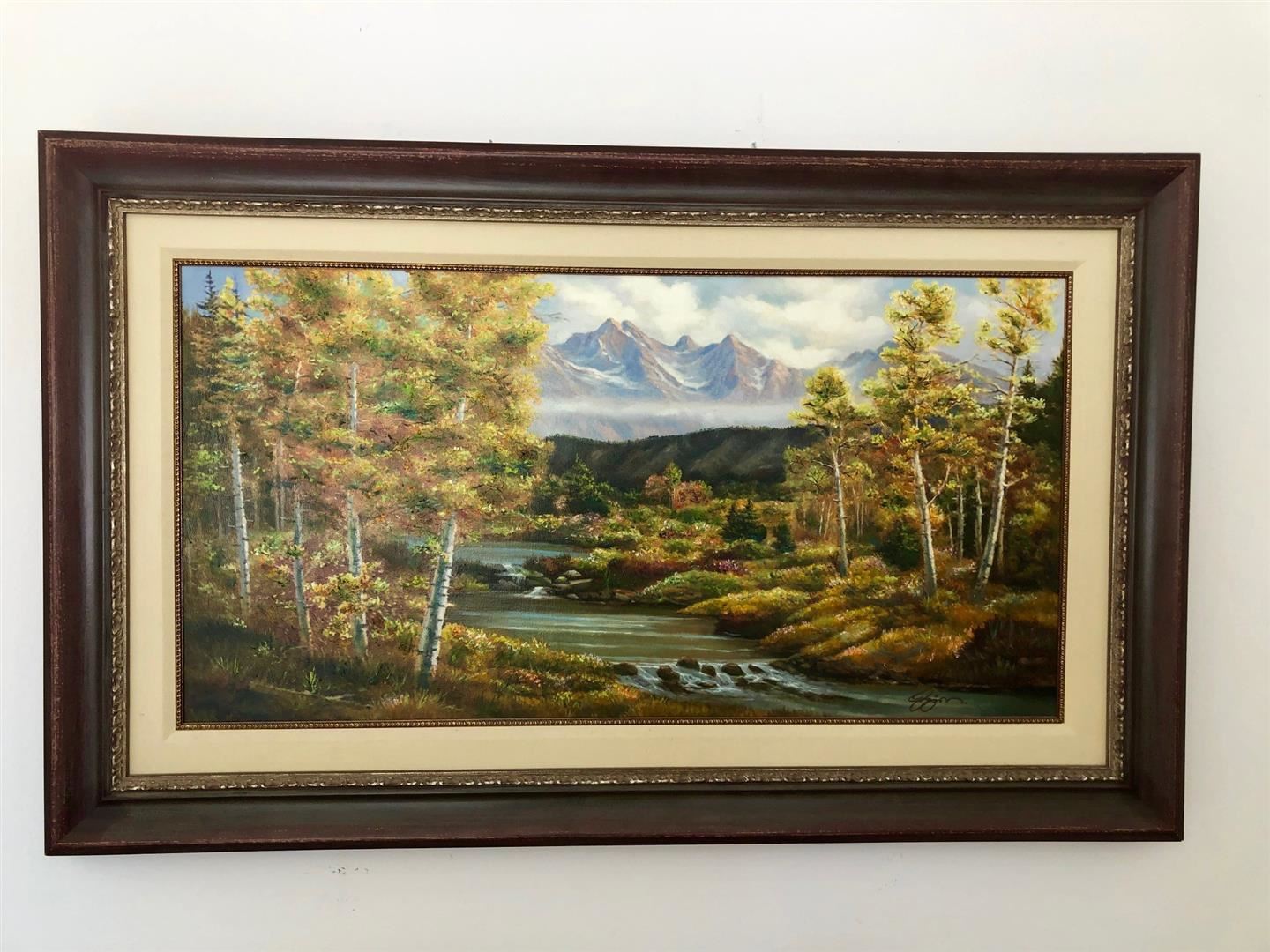 Peruvian artist Bocci created this 24x48" oil on canvas. It is a 30x54" framed landscape of the Rocky Mountains outside Aspen Colorado