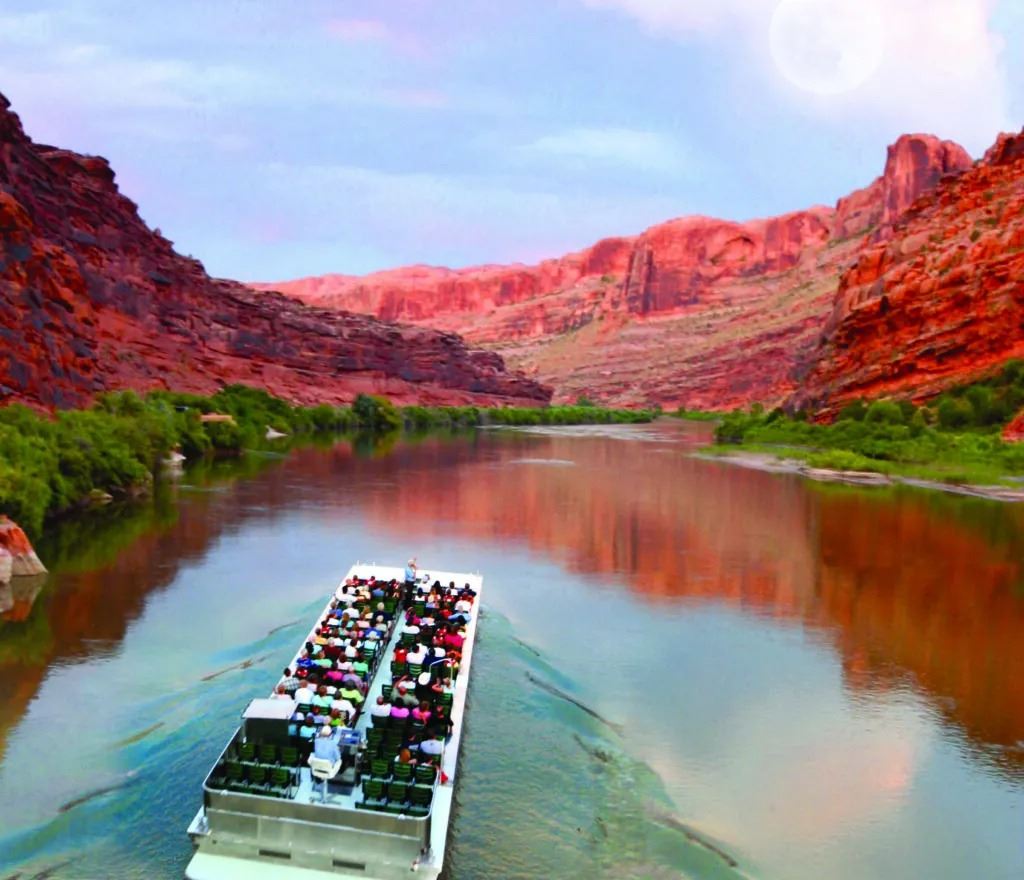 As twilight descends over Moab, the desert transforms into a realm of shadow and flame. Step aboard your jet boat and glide along the glassy surface of the mighty Colorado River, its dark waters mirroring the fiery hues of the canyon walls. Towering sandstone cliffs rise hundreds of feet above you, their colors deepening from gold to rust to violet as the last light of day fades beyond the horizon. The air is cool, the river calm — and every turn feels like drifting deeper into the heart of the American West.