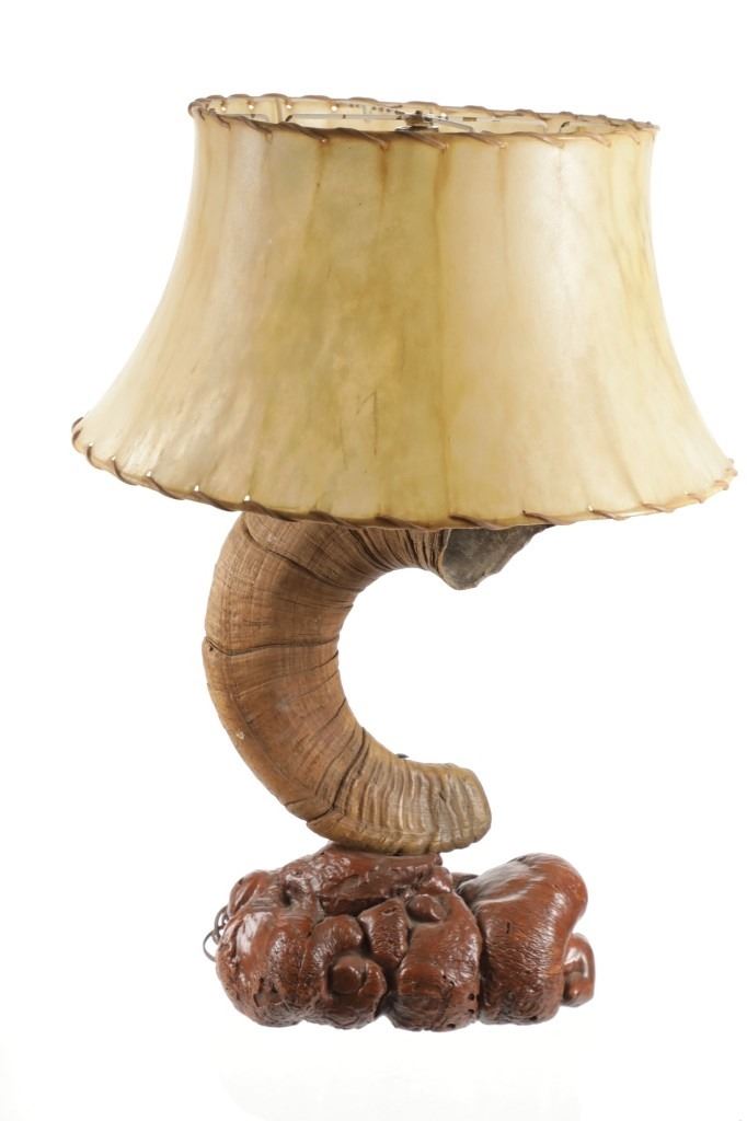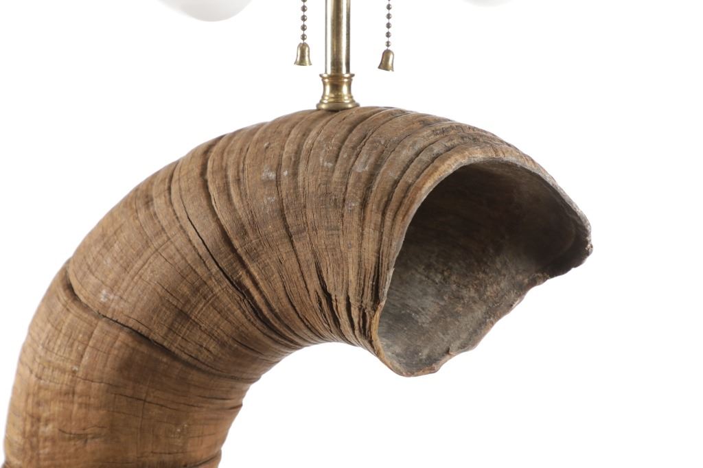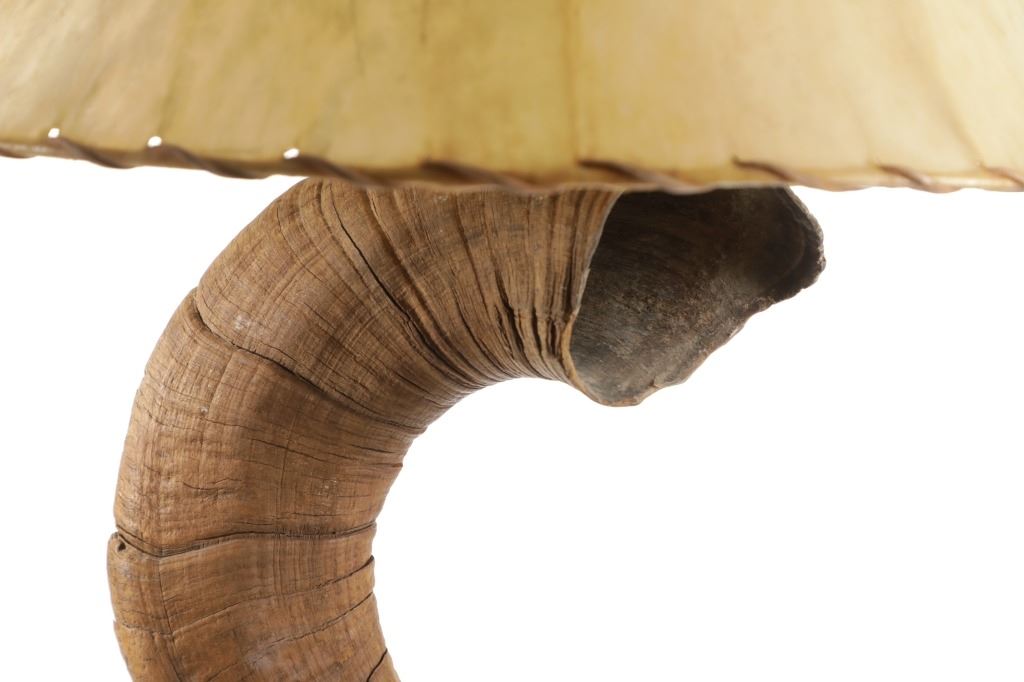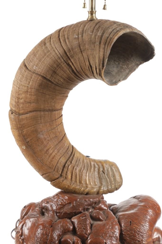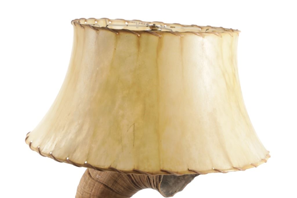 Featured in this lot is this Rocky Mountain Ram horn burl wooden rawhide lamp and shade. The lamp features a wonderfully and professionally crafted genuine Rocky Mountain ram horn mounted on a excellent example of burl wood with a well preserved stretched rawhide lamp shard with rawhide string fastening the shade on. The ram horn presented here does have a plug indicating it was legally taken in the state of Wyoming. The condition of this lamp is well preserved with no obvious signs of damage and shows a well preserved overall condition. The measurements of this lamp is 29" x 16" x 16". The collective weight of this lamp is 13lb.