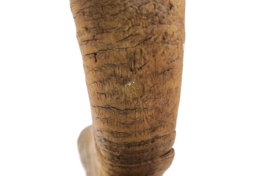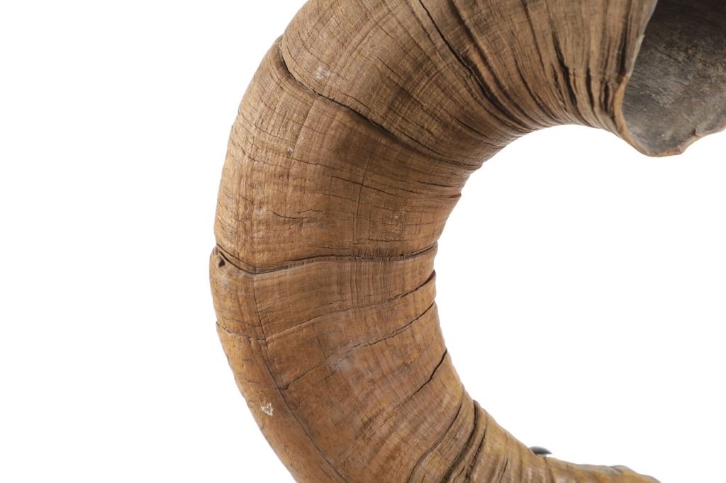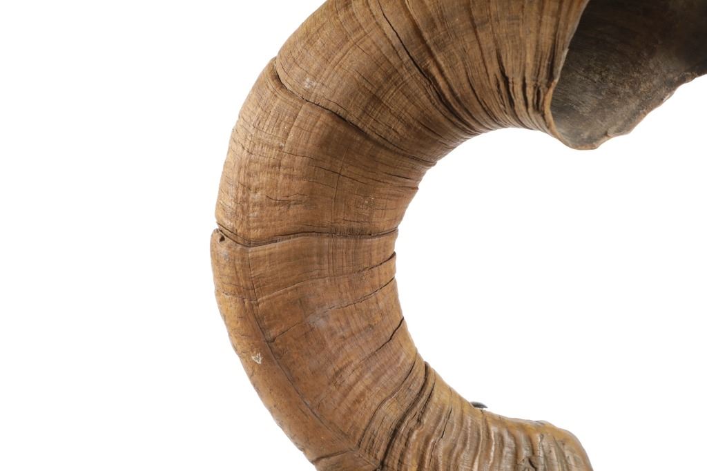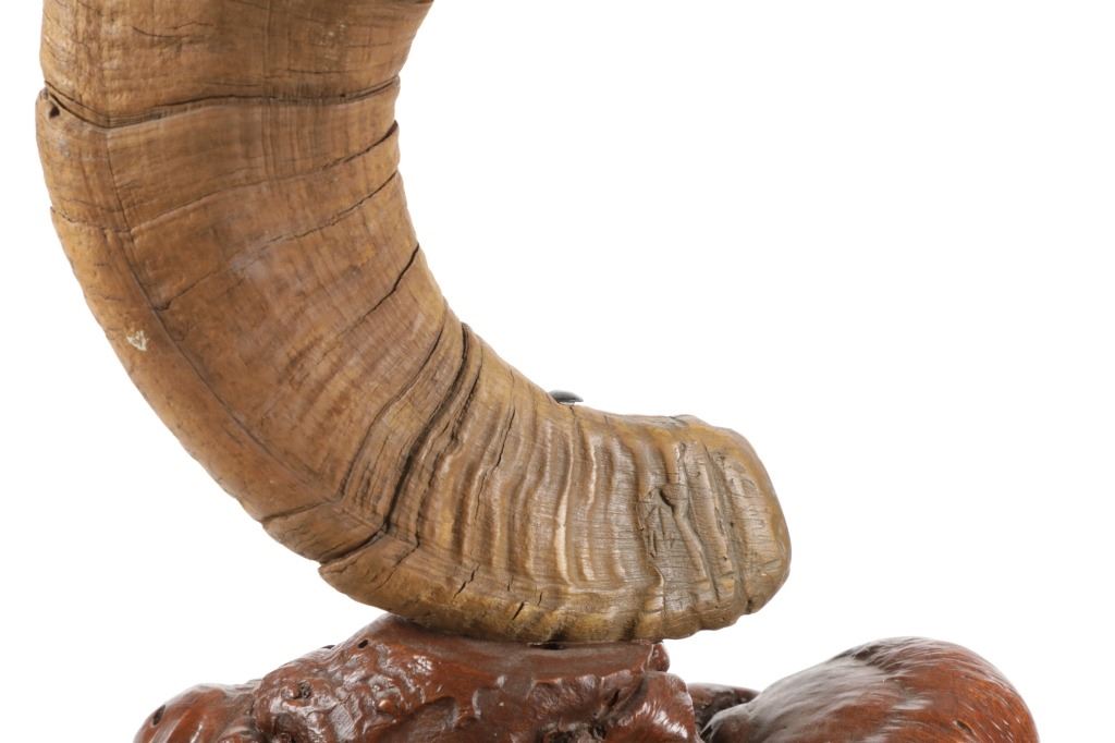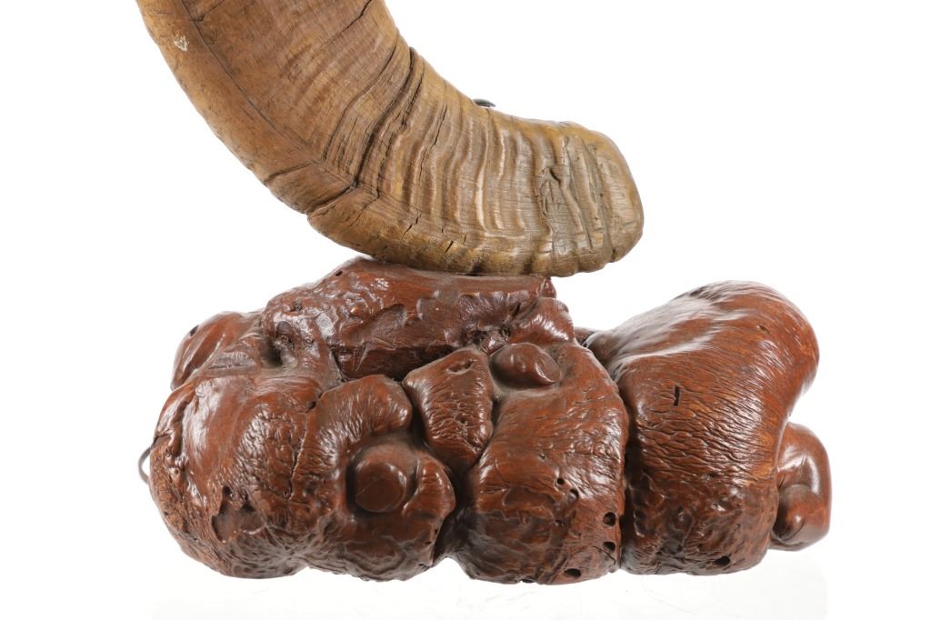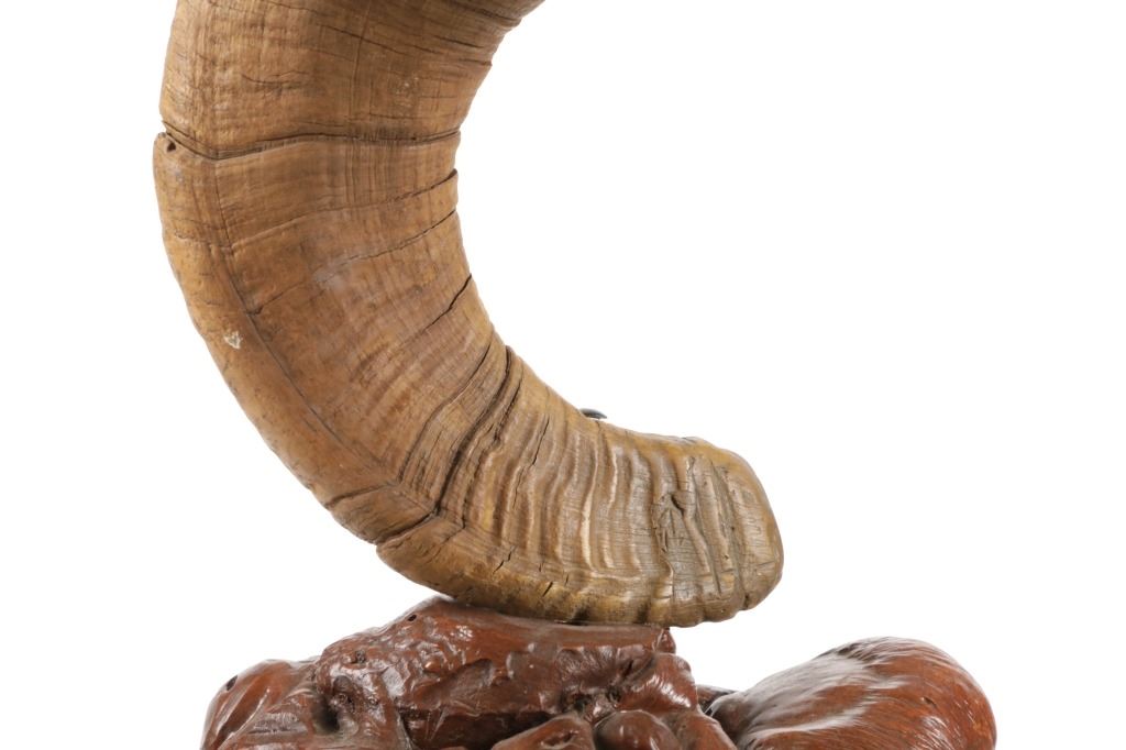 Featured in this lot is this Rocky Mountain Ram horn burl wooden rawhide lamp and shade. The lamp features a wonderfully and professionally crafted genuine Rocky Mountain ram horn mounted on a excellent example of burl wood with a well preserved stretched rawhide lamp shard with rawhide string fastening the shade on. The ram horn presented here does have a plug indicating it was legally taken in the state of Wyoming. The condition of this lamp is well preserved with no obvious signs of damage and shows a well preserved overall condition. The measurements of this lamp is 29" x 16" x 16". The collective weight of this lamp is 13lb.