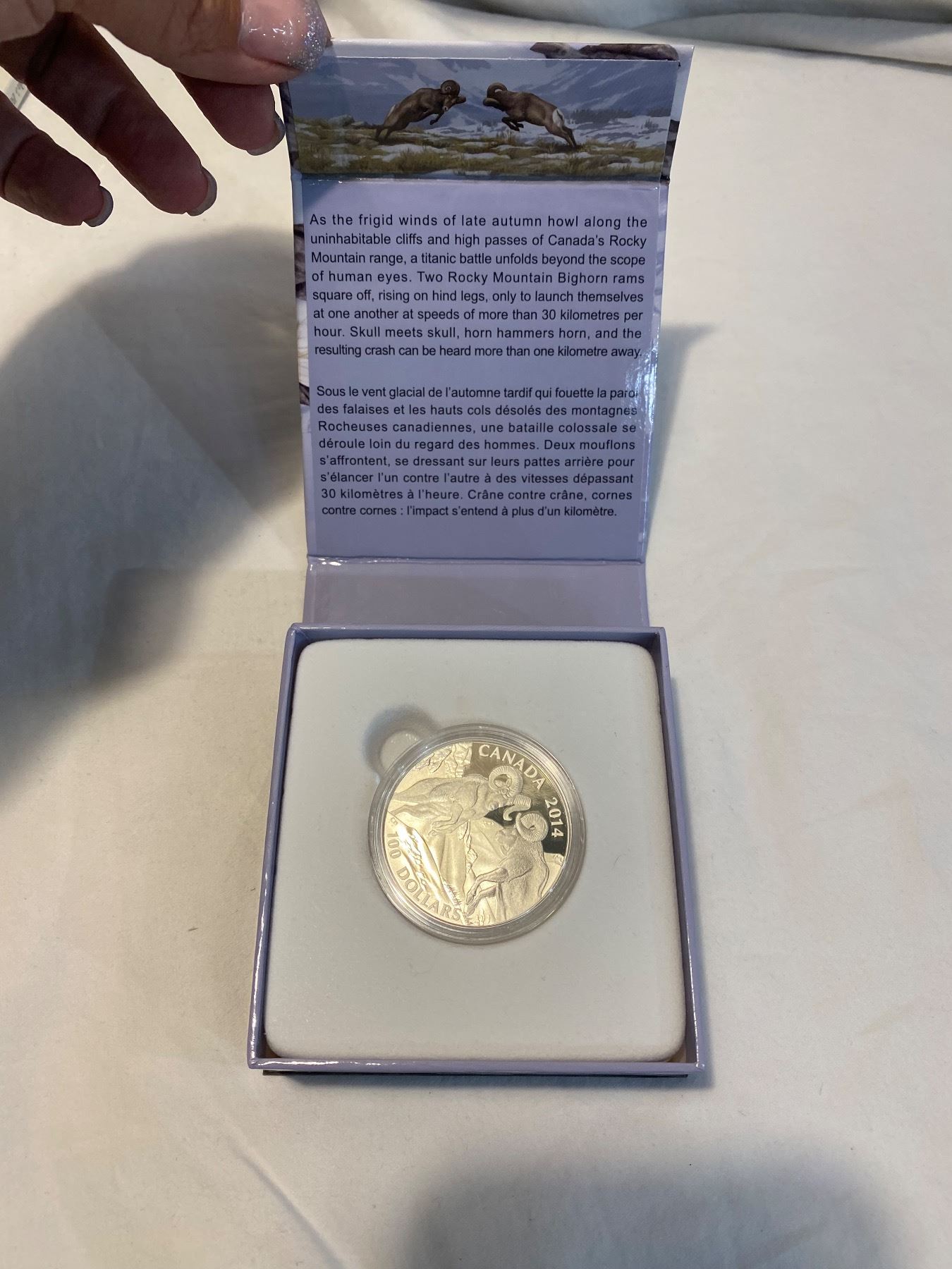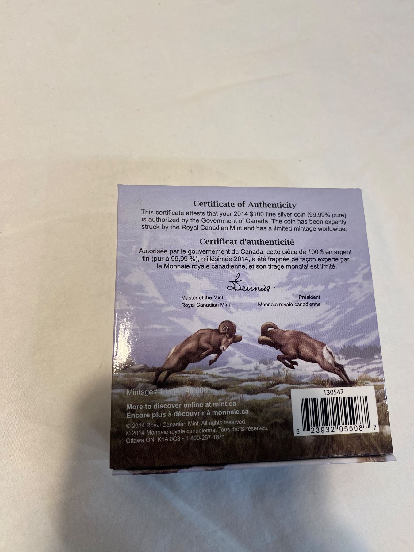 Rocky Mountain big horn sheep $100 99.99% silver with certificate of authenticity on box proof