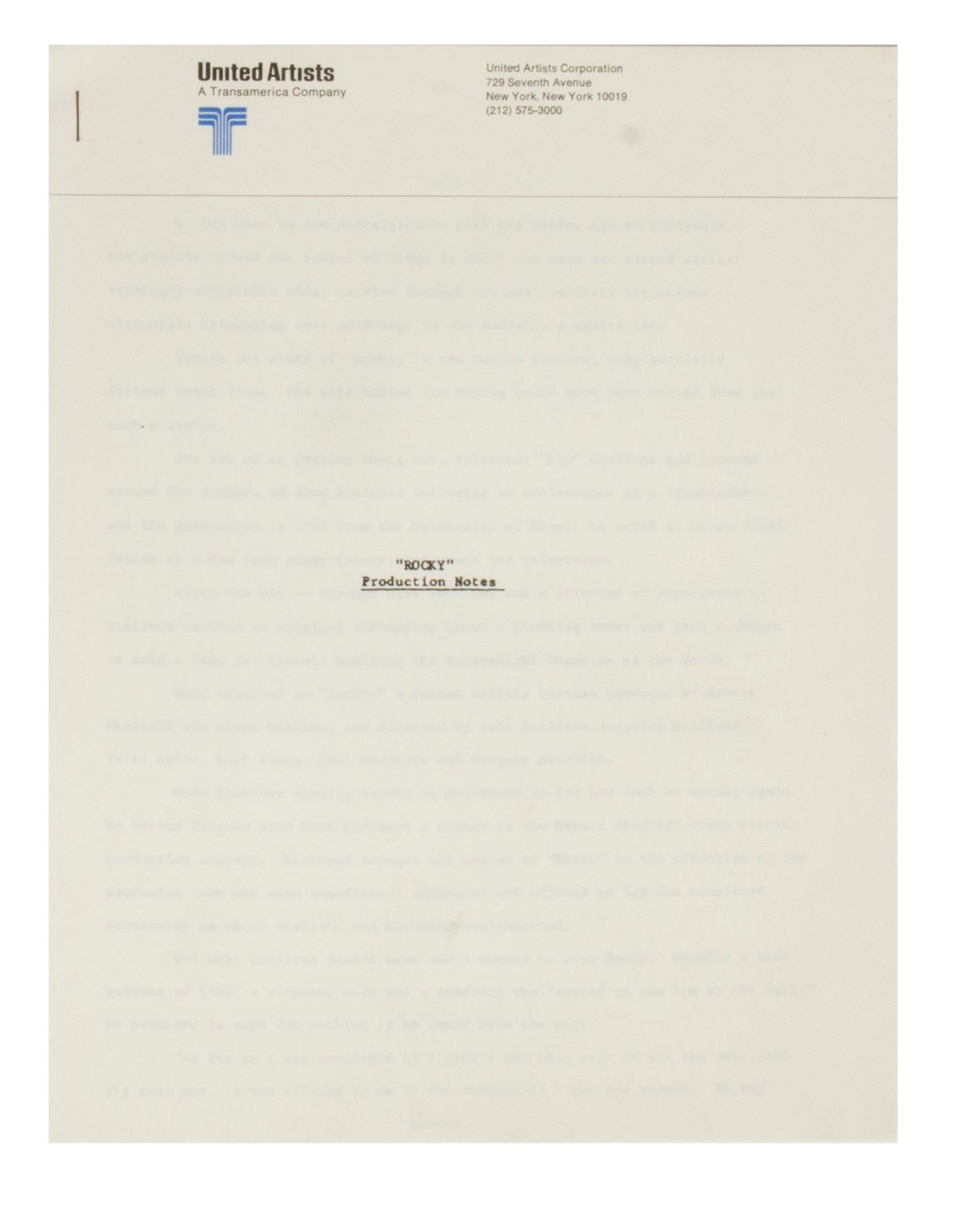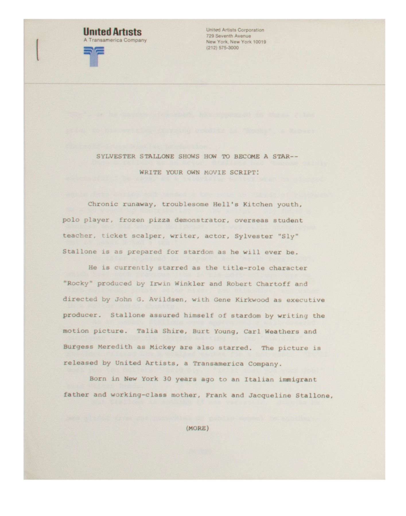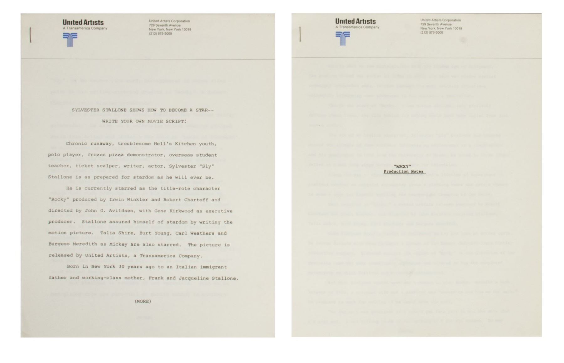 (United Artists, 1976) A pair of typed production information packets prepared by United Artists prior to the theatrical release of their feature film "Rocky". These packets were created to provide information on the production before its release and are titled "Rocky Production Notes" and "Sylvester Stallone Shows How to Become a Star-- Write Your Own Movie Script!". These packets are dated 9-15-76 and 9-3-76 respectively, and provide a wealth of information on the cast, crew, and story, of what would go on to become one of the most iconic films of the generation. Both packets measure 11"x8.5" and are in very good condition with little wear.