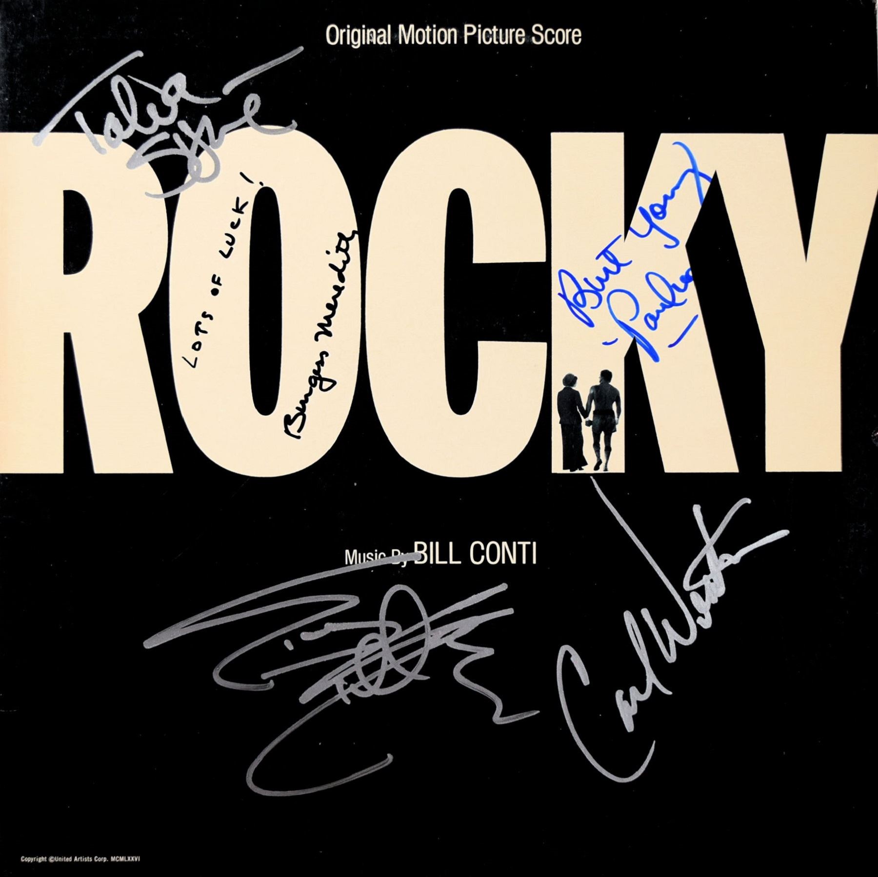 Rocky soundtrack album. Signed: Sylvester Stallone, Talia Shire, Burt Young Paulie, Lots Of Luck! Burgess Meredith & Carl Weathers.