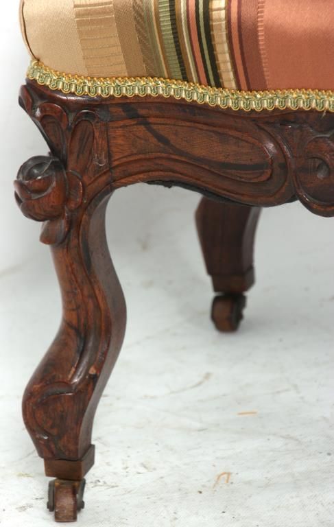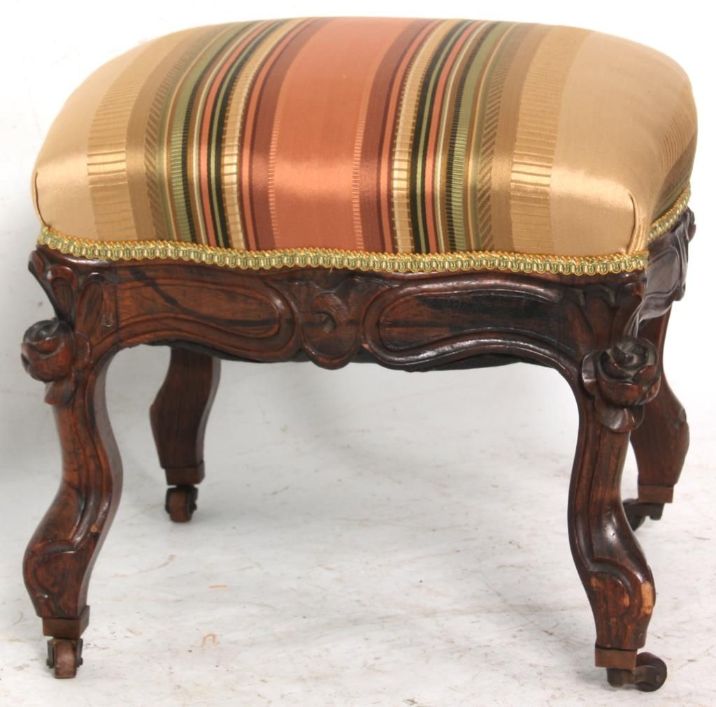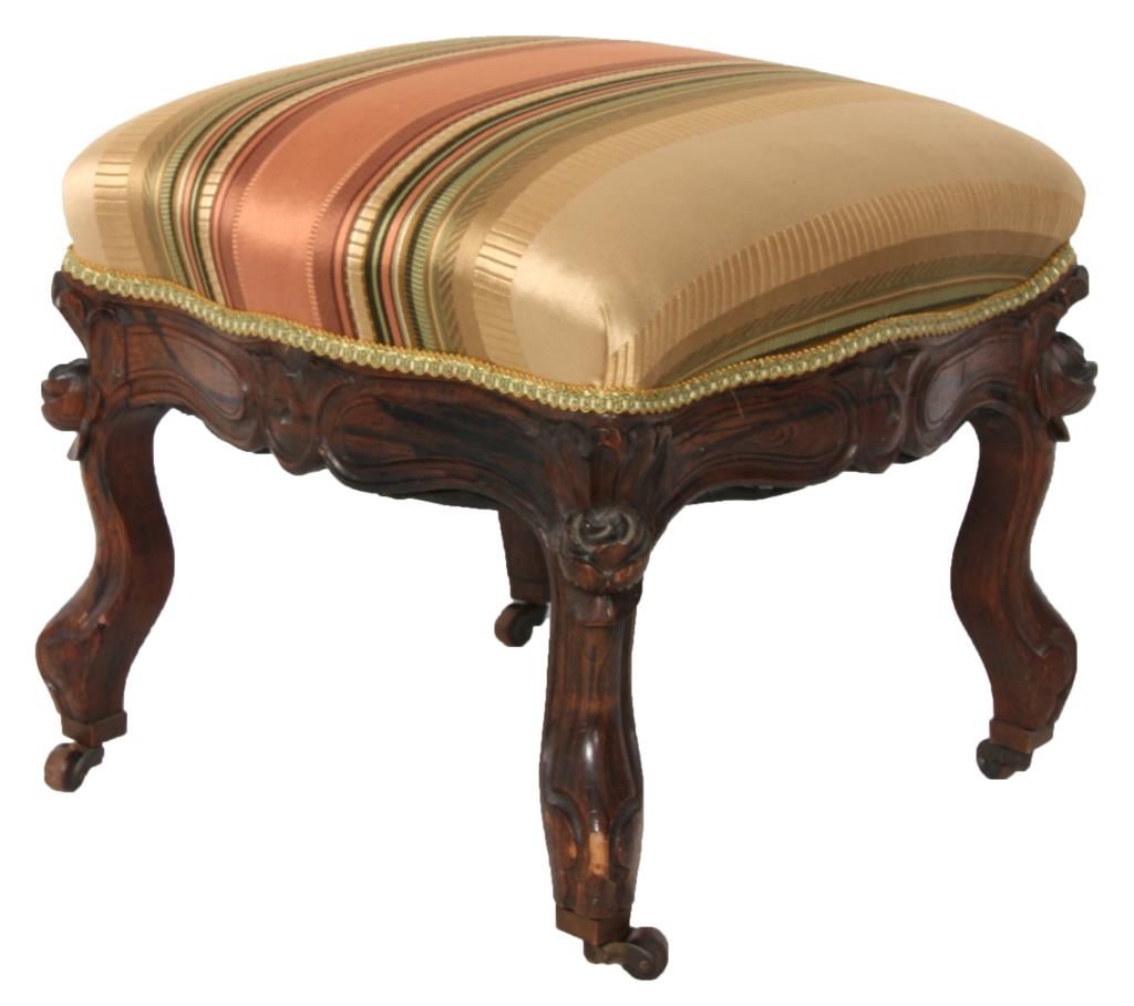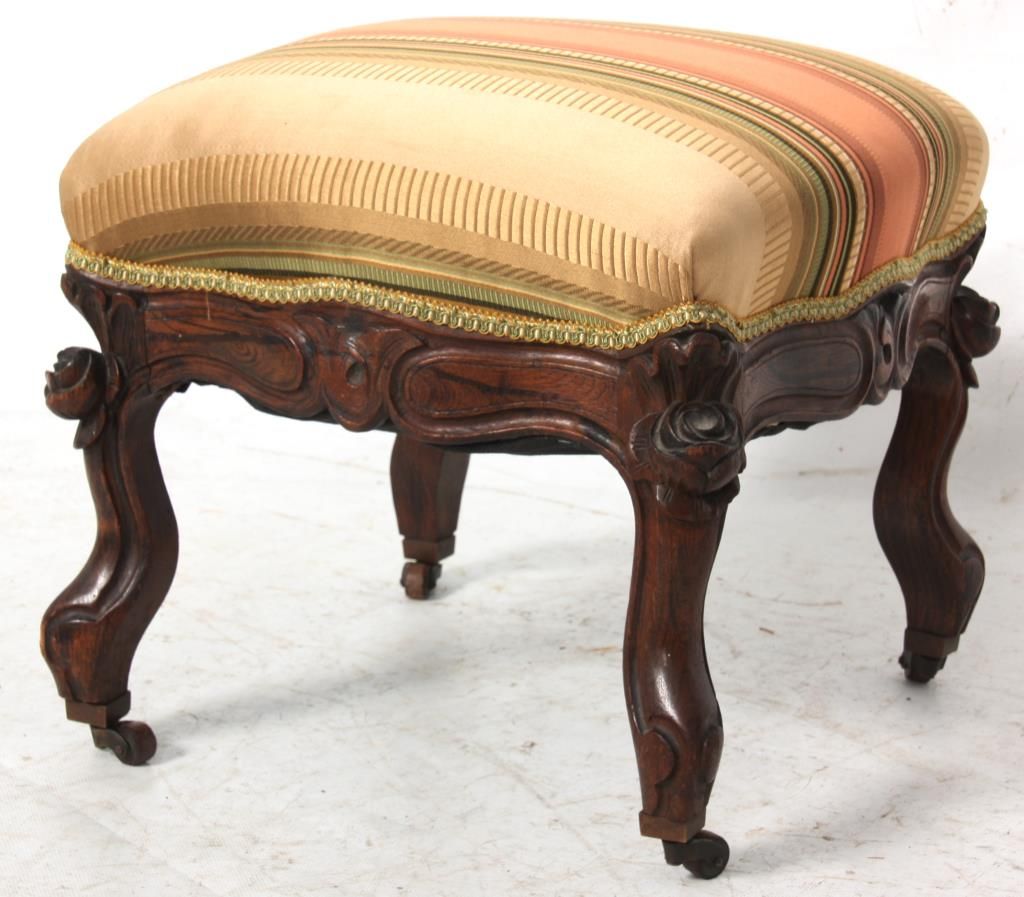 Rococo Carved Foot Stool. Rosewood grained walnut foot stool has a padded and upholstered top with serpentine apron and a single rose carved at the top of the cabriole legs. In very good condition, original finish. 14 in. high x 15.5 in. wide x 15.5 in. deep.