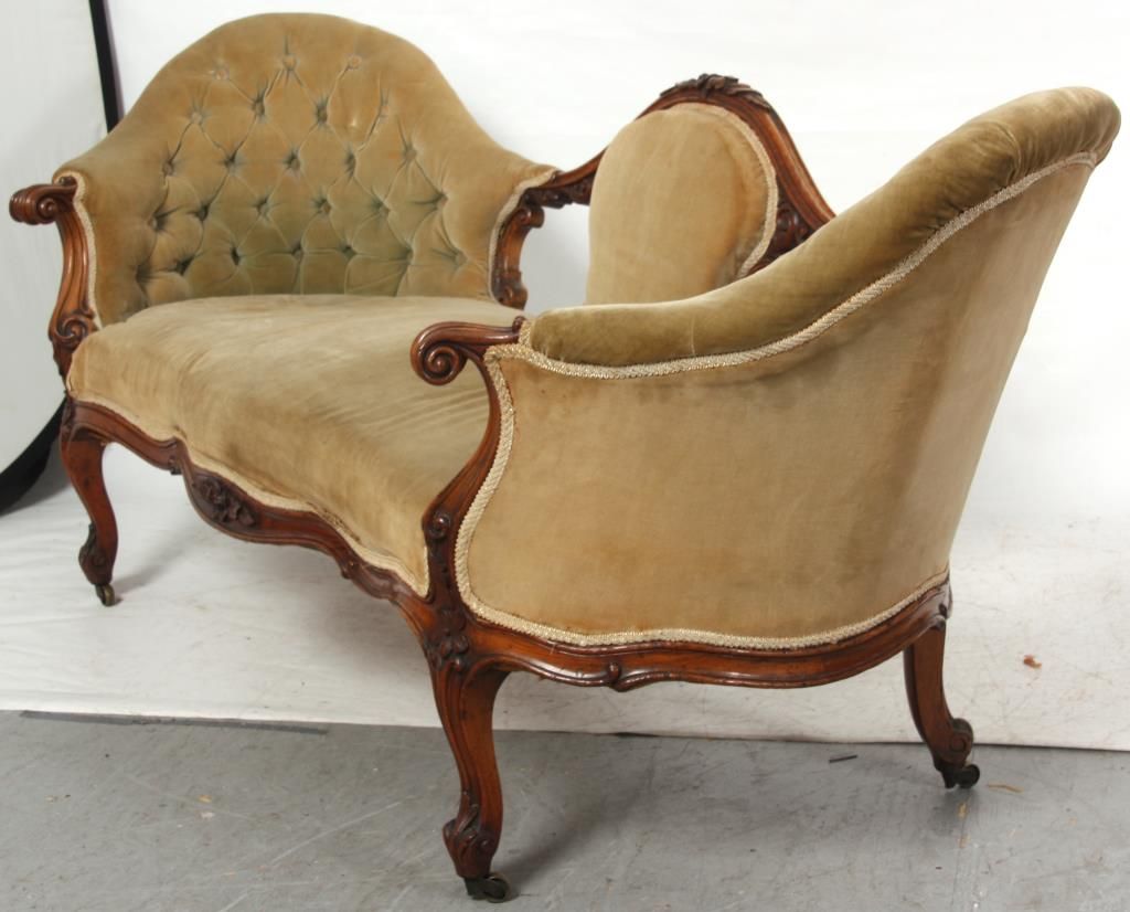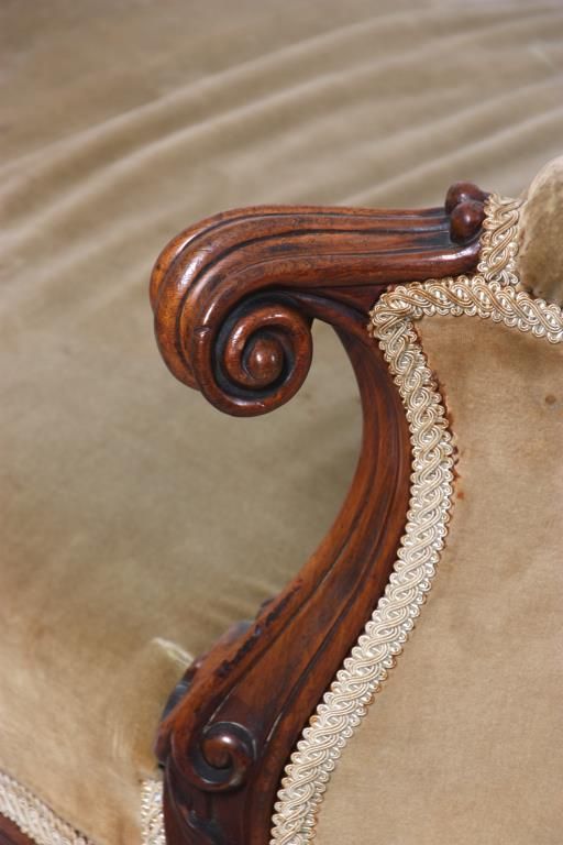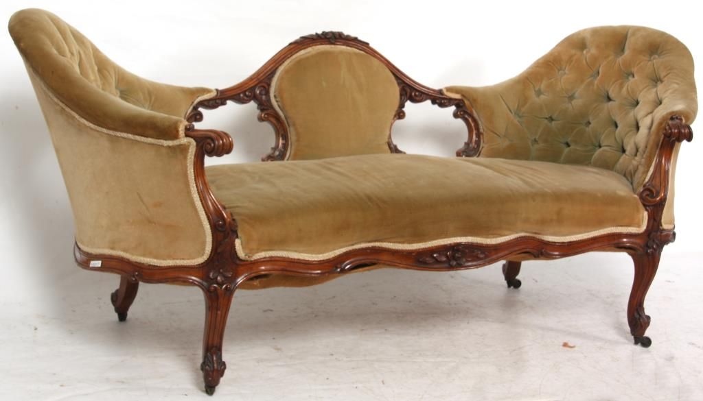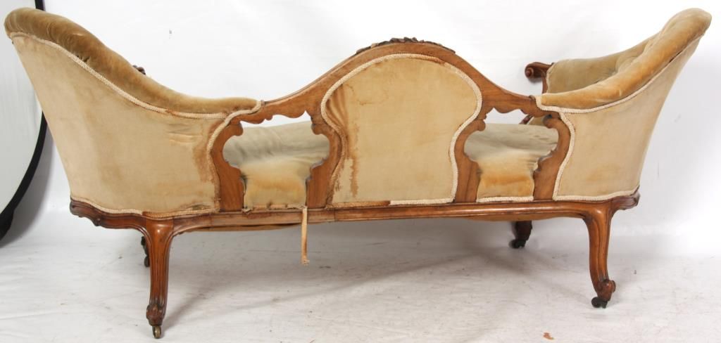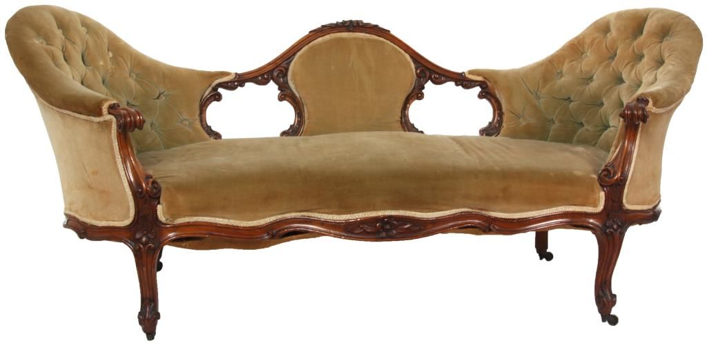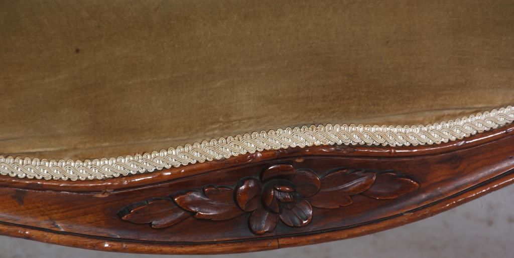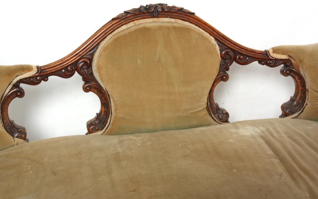 Rococo Carved Walnut Triple Back Settee. Has a serpentine back with arched floral carved center crest, over a padded center and open sections to the left and right, has high swooping sides upholstered with tufted backs, padded crests and continuous arms ending at scrolling carved knuckles. The arms have carved supports, serpentine seat rail and stands on cabriole legs with a single flower at the knee and leaf scrolled feet. In very good condition and original finish. 32 in. high x 74 in. wide x 26 in. deep.