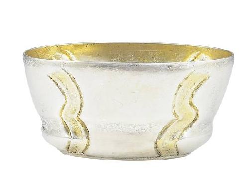 Silver, 47 g, with vermeil inside. Oval body made of one plate, S shape fluting, four lobes. Minor restoration. Unmarked, German, circa 1760. Size: 8.2 x 5.6 x 4.3 cm