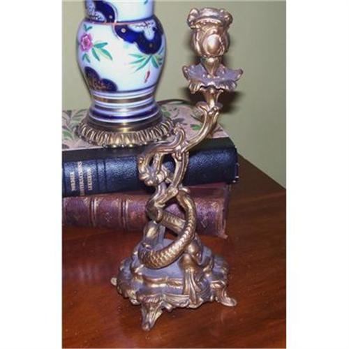 Interesting rococo candlestick in the form of a mythical dolphin, very much in the French Louis XV style of the 18th century.  This items dates to the early 20th century however, and is cast in white metal, probably spelter.  It has a gilt finish, mostly still present.  The candle cup is in the form of a stylized flower, the bobeche lays open like petals of a flower.  The column is comprised of the florishes typical of the period, entertwined with the dolphin's tale.  The base the dolphin is curled upon is raised on four feet and is 5" in diameter.  In very good condition overall, but has one curly-q tip missing.