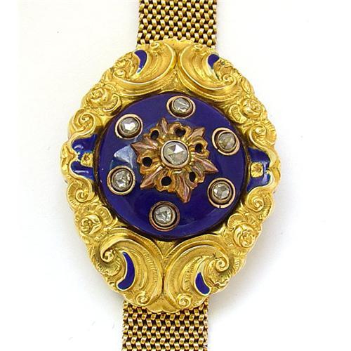 This stunning neo-rococo bracelet features a deep blue enamel circle with a center faceted rose bezel-set diamond. The rose cut diamond is set in an openwork gold rosette, surrounded by six similarly sized bezel-set rose cut diamonds. An elaborate oval frame of highly stylized gold scrollwork with deep blue enamel details completes the ensemble. The interlocking gold mesh band closes with a box clasp. Safety chain with a hook. Fully marked for Austria- Hungary on clasp spring and on back of central oval motif.