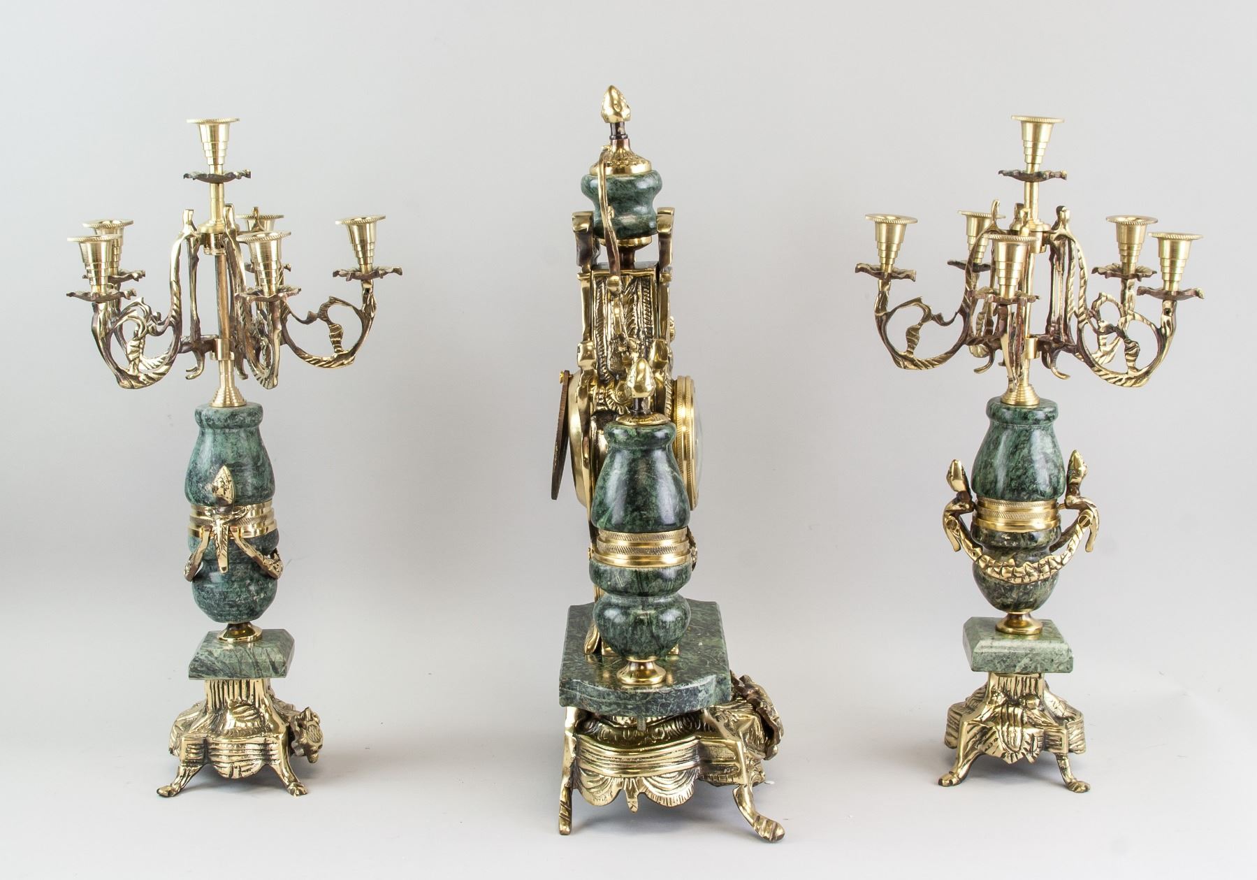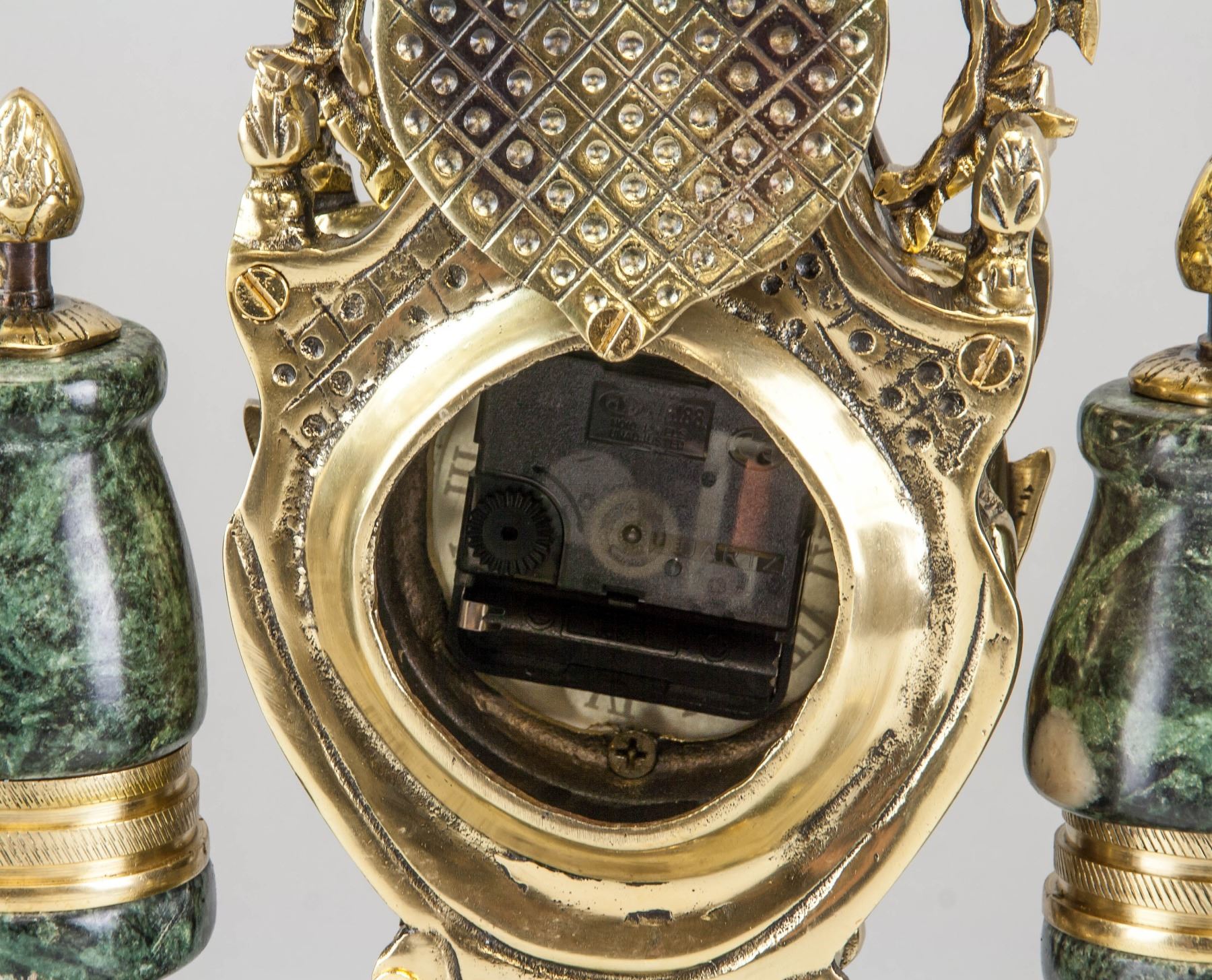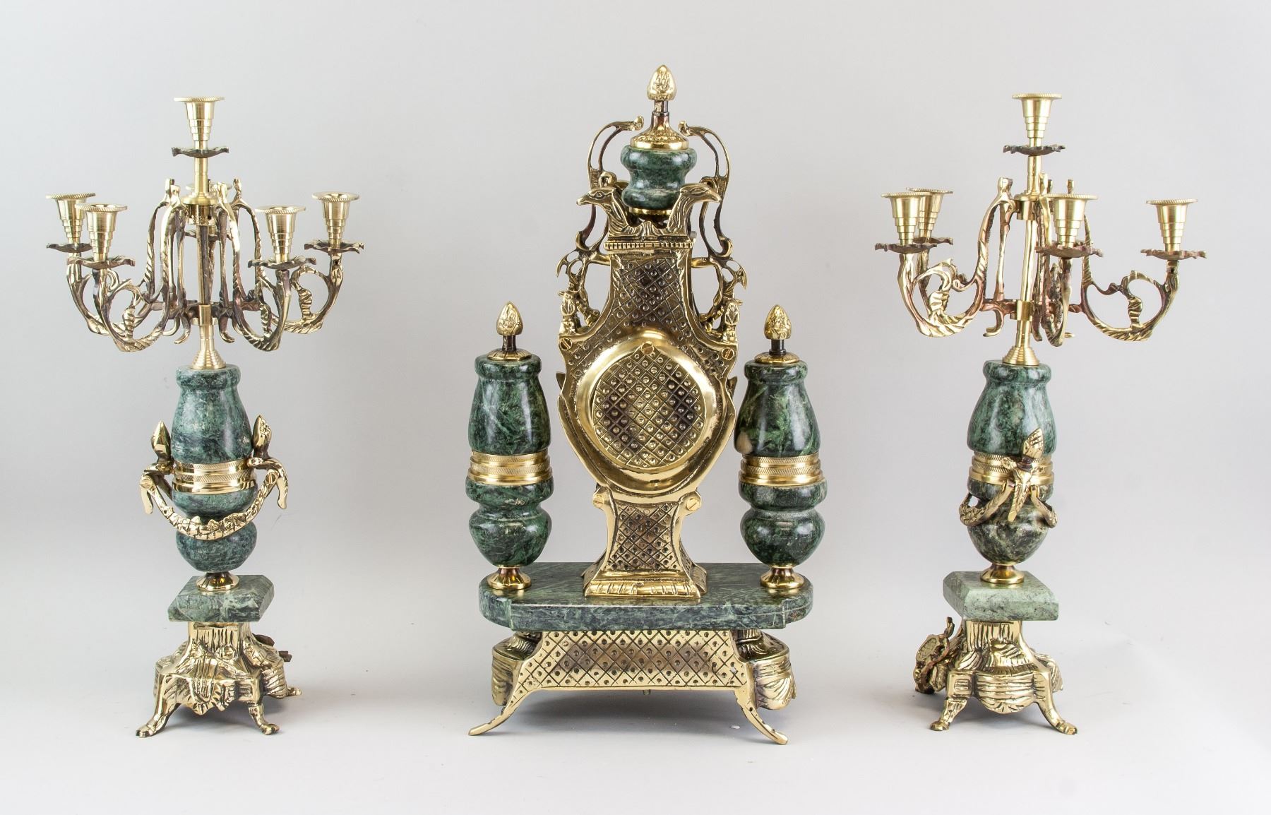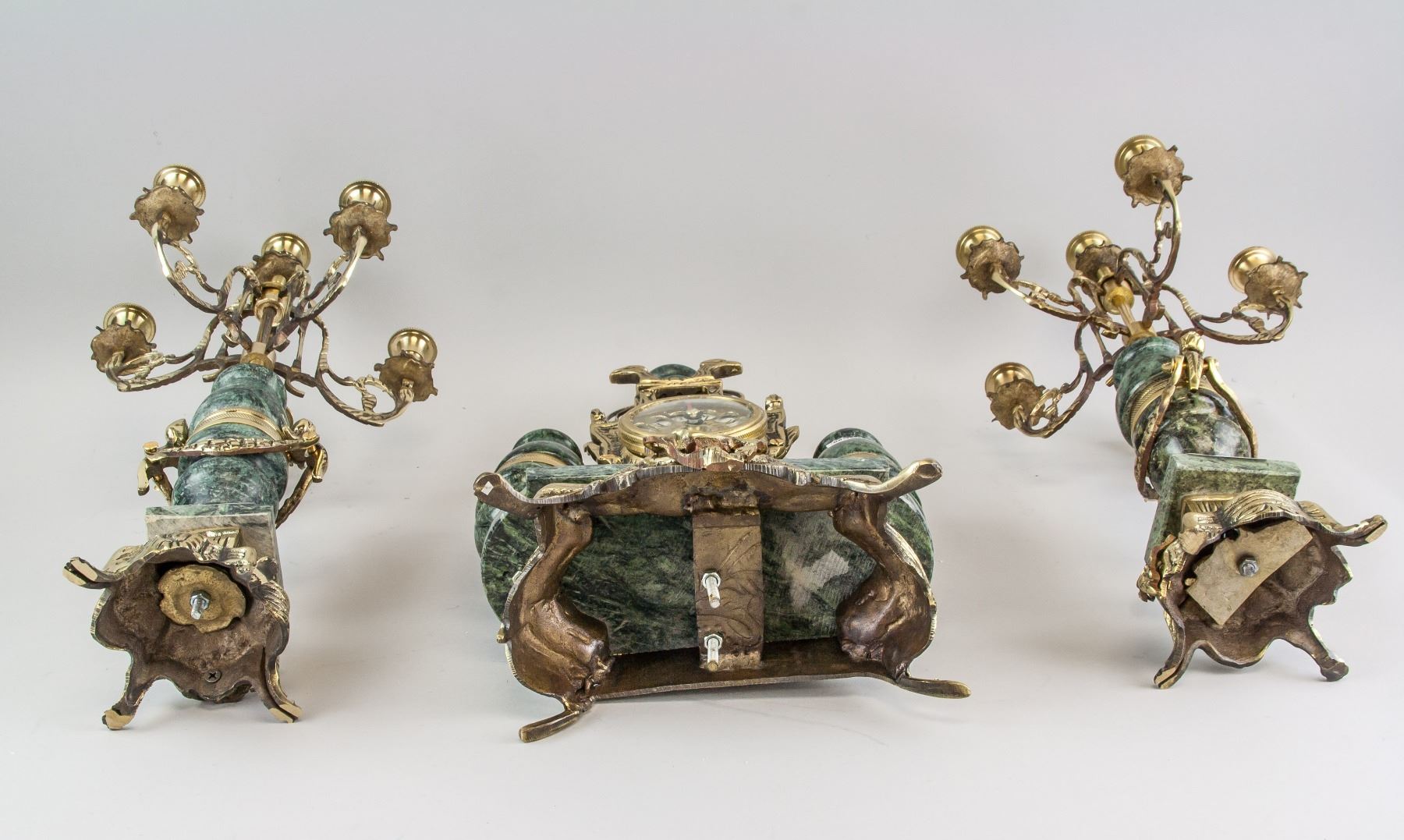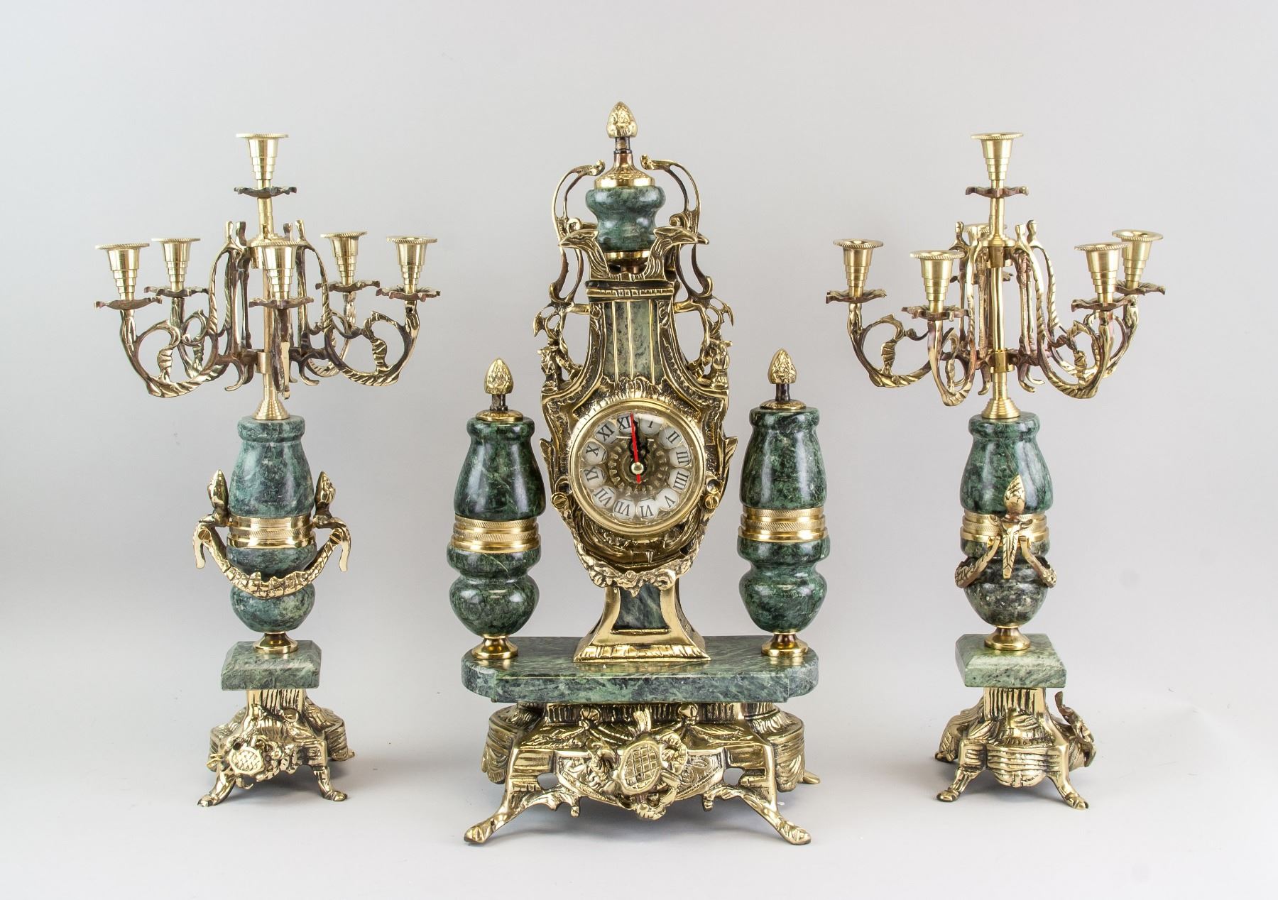 Rococo style table clock and candle stands set, of marble and metal parts, with quartz movement, 49 x 25 cm. Private estate (Connecticut, United States)