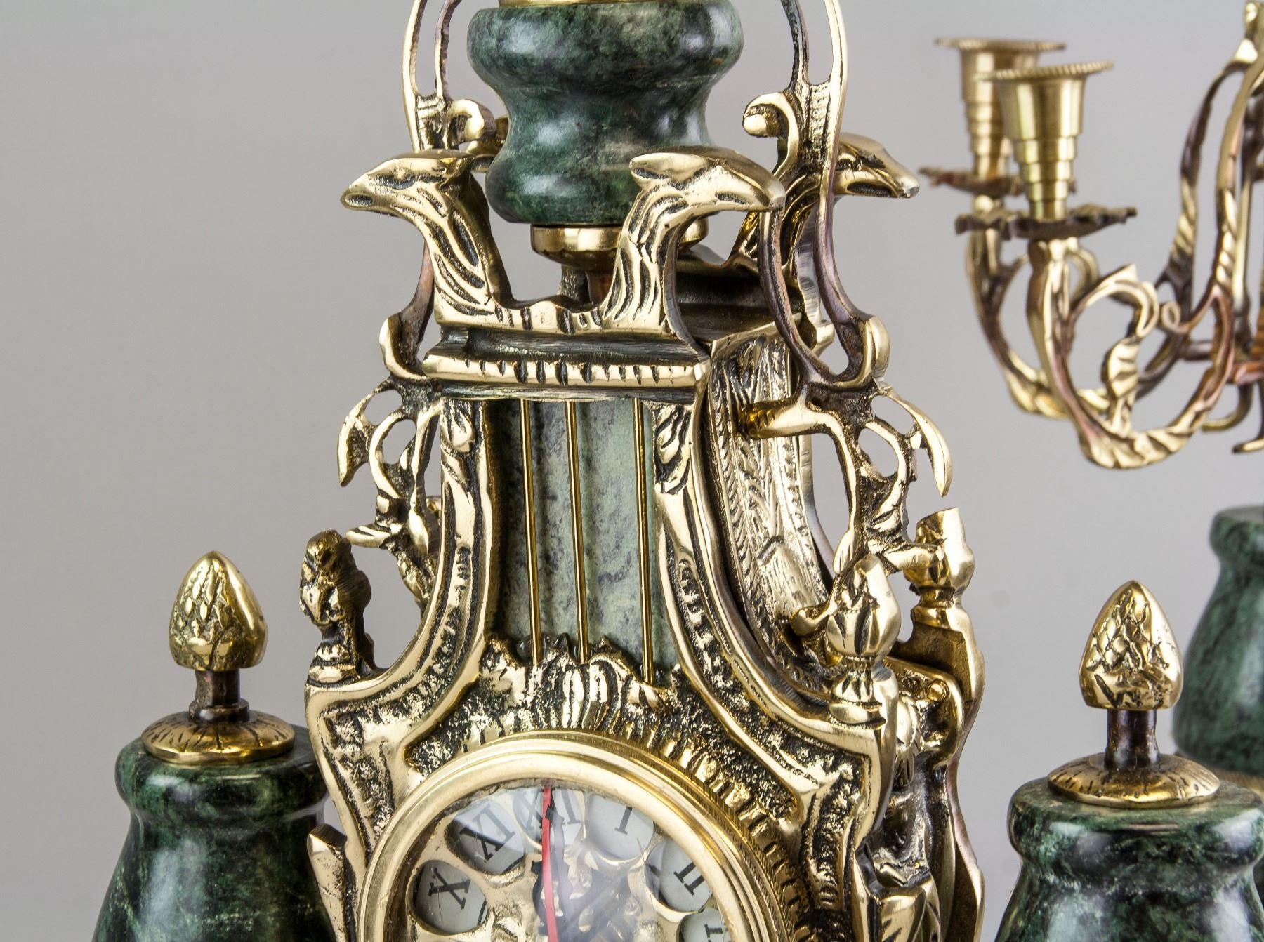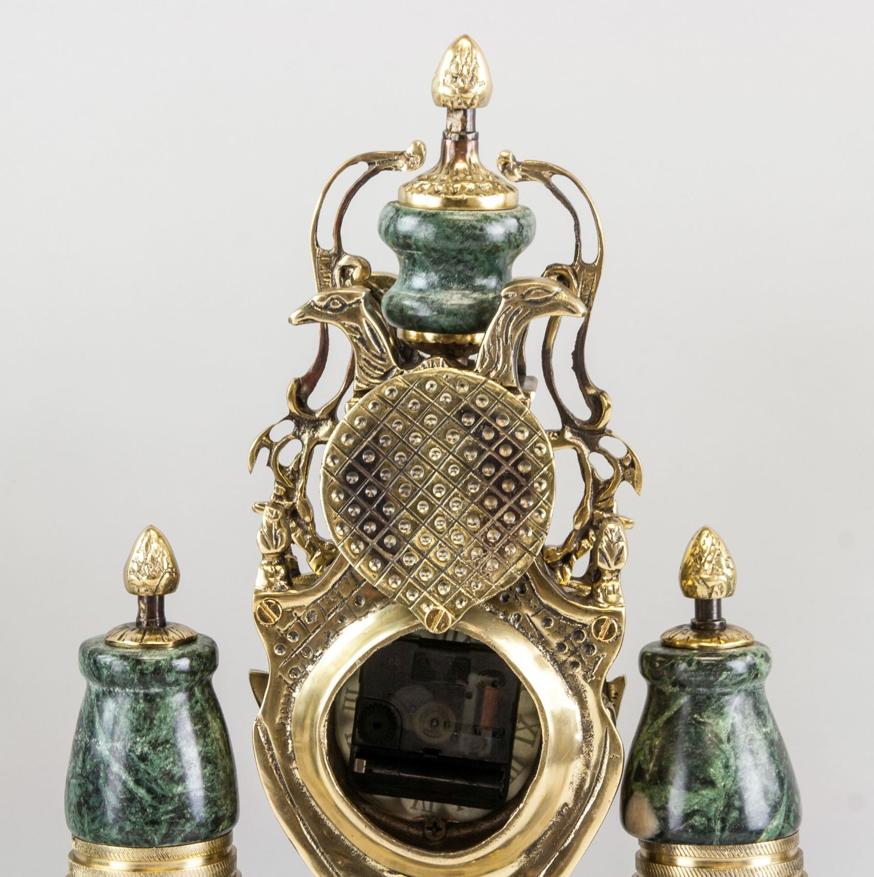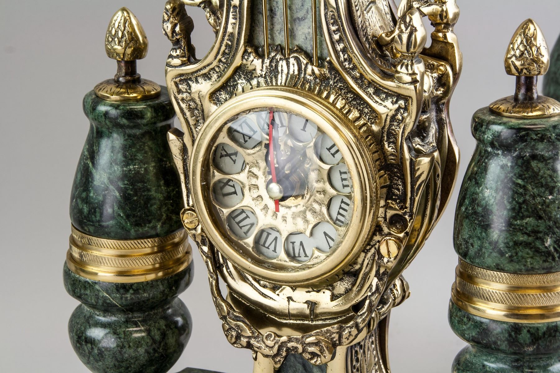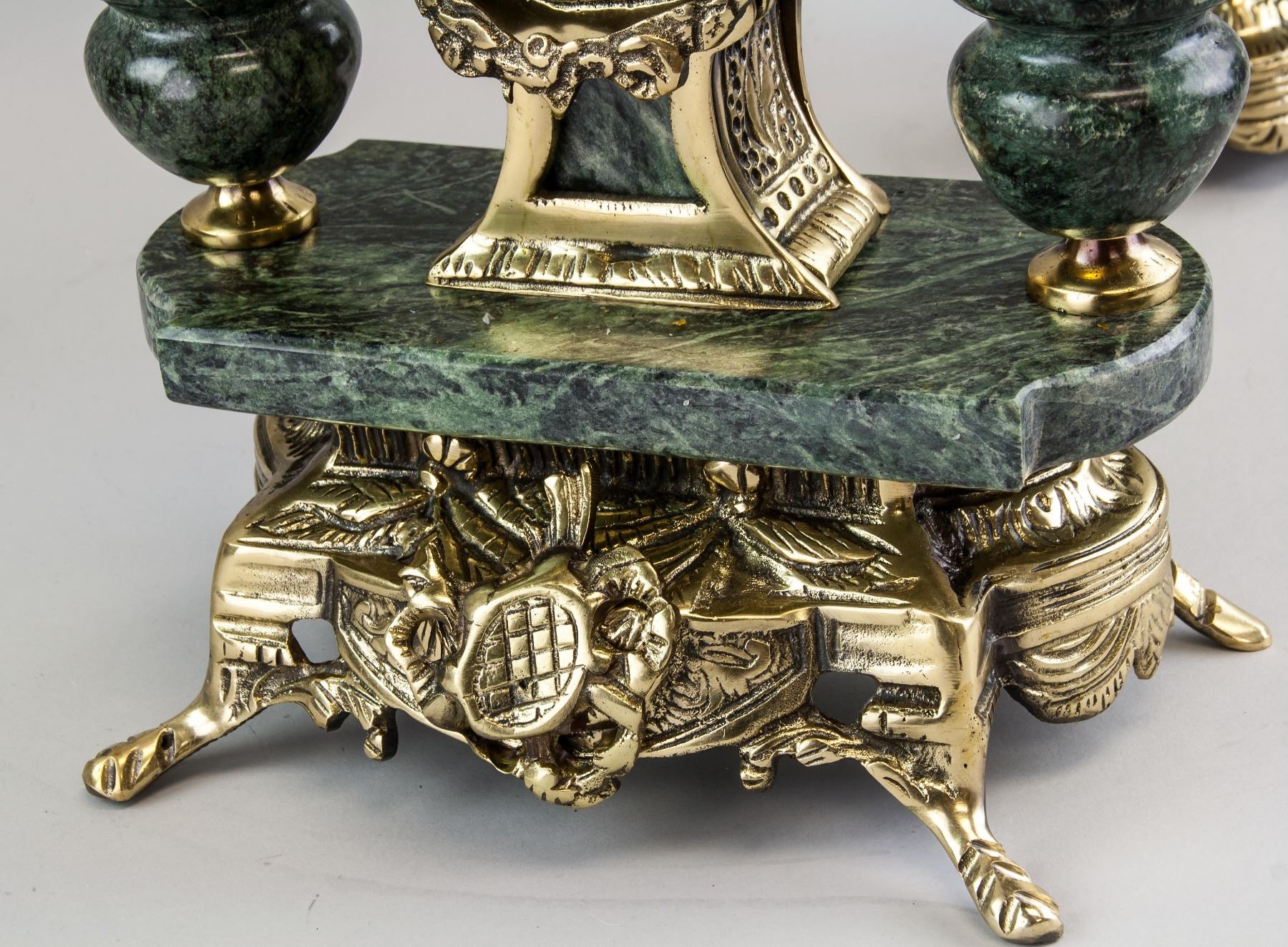 Rococo style table clock and candle stands set, of marble and metal parts, with quartz movement, 49 x 25 cm. Private estate (Connecticut, United States)
