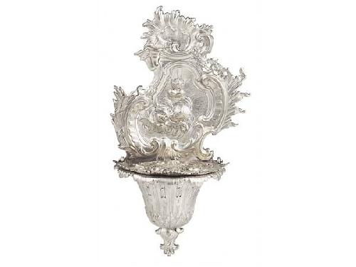Silver, 205 g. Richly chased and matted rocaille frame with winged angel heads. Above them there is a heart surrounded by a crown of thorns. Stylised floral ornamentation on the holly-water stoop with hinged cover, cast decoration on the lower part. Marked: Vienna, 1747, Antoni Schneider. Reitzner: 640. Size: 21 cm