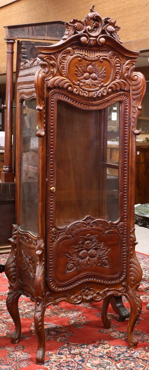 Rococo style vitrine, executed in mahogany and having a relief carved case with floral medallions and rising on cabriole legs, 79''h x 27''w x 18''d