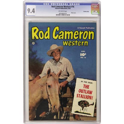 <B>Rod Cameron Western #16 Crowley Copy pedigree (Fawcett, 1952) CGC NM 9.4 Off-white pages.</B></I> Photo cover. Overstreet 2006 NM- 9.2 value = $165. CGC census 10/06: 1 in 9.4, none higher.<BR><BR><b>Shipping:</b> Slabbed Comic (<a target="_blank" href="http://www.heritageauctions.com/common/shipping.php">view shipping information</a>)
