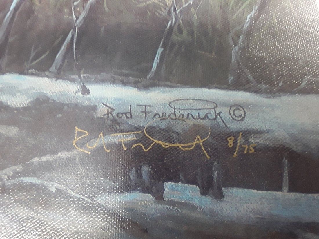 Rod Frederick's "The Wake Up Call" limited edition canvas signed and numbered 8/75. This canvas is in mint condition and has never been framed. 24" X 48".