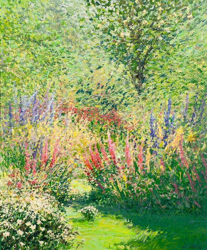 To the unaided eye, this piece appears to be in very good condition. Inspection under ultraviolet light reveals normal fluorescence of the artist's pigments. The piece is framed in a semi-ornate gold frame with a linen liner. The frame is in good condition, showing normal signs of wear. Plate: Sarah's Garden, Rod Gobel [sic] Verso: [handwritten on back of stretcher bar] 36x30 © Rod Goebel NAWA "Sarah's Garden"; [sticker on back of frame] Trailside Galleries/ Mollring Gallery, Scottsdale, AZ.