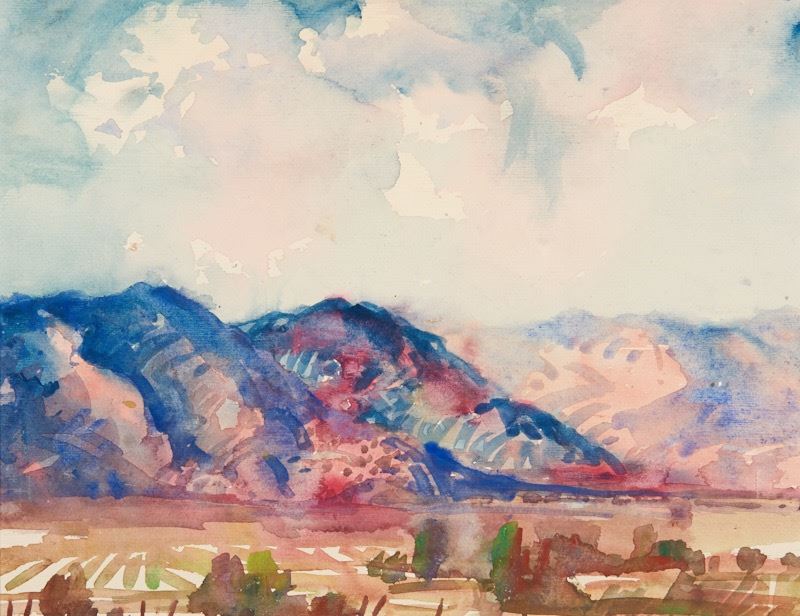 To the unaided eye, this piece appears to be in very good condition. Inspection under ultraviolet light reveals a normal fluorescence of the artist's pigments. There are no signs of damage or restoration. The piece is mounted under glass with a white mat and is framed in a dark, stained wooden frame. The frame is also in very good condition. Verso: [letter attached to backing] To whom it may concern, This watercolor painting, a 13 3/4 inch by 10 1/4 w/c on paper, is entitled 'Taos Fields' and was gifted to Janet Zmolek by the artist Rod Goebel, who painted it in 1980. Donna Goebel, wife of Rod Goebel; [tag attached to backing] Jackson's International, Mar 2017