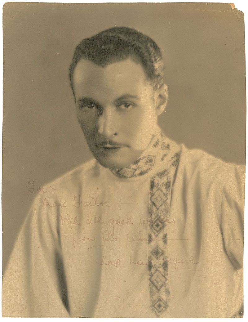 Vintage matte-finish 10.25 x 13.25 photo of La Rocque wearing an extremely ornate scarf, signed and inscribed in fountain pen, “For—Max Factor—With all good wishes, from his friend Rod La Rocque.” In very good condition, with a few creases, bit of paper loss to upper right corner tip, and signature and inscription light but legible.