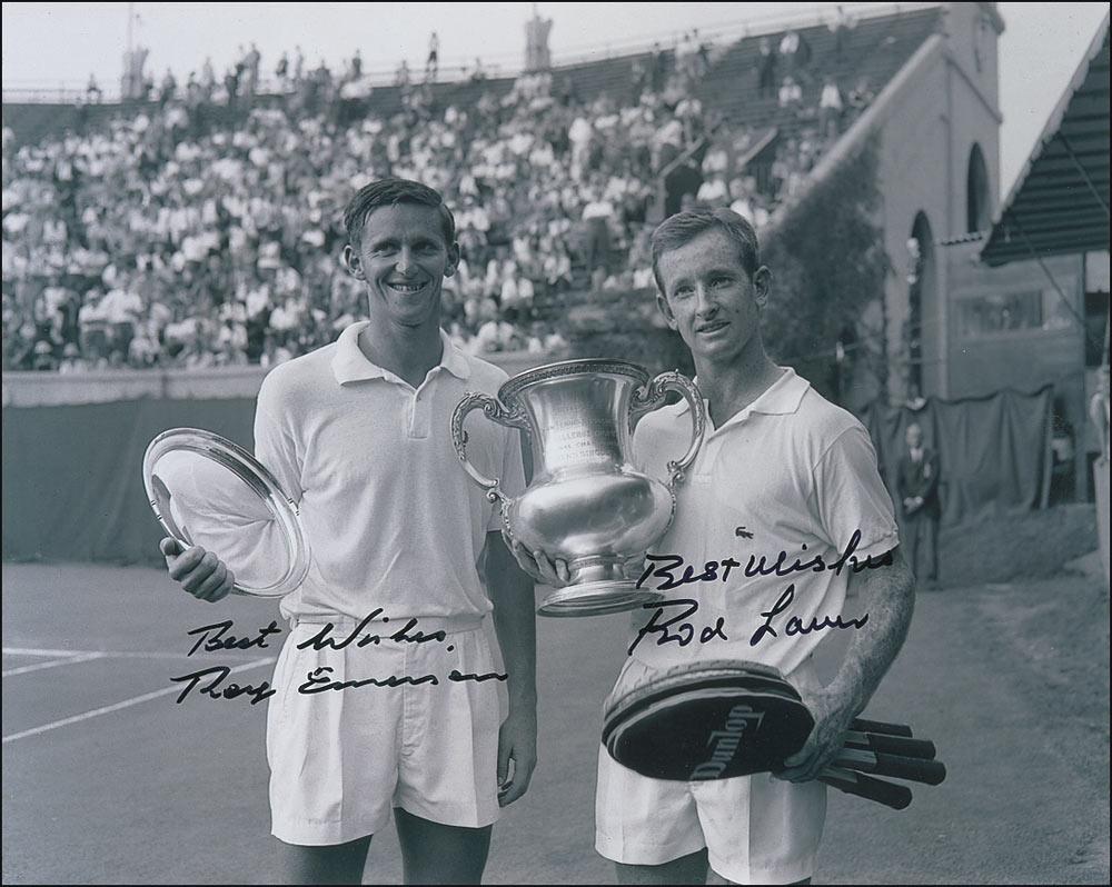 Glossy 10 x 8 photo of Laver and Emerson posing with their respective trophies, signed in black felt tip by both. In fine condition.