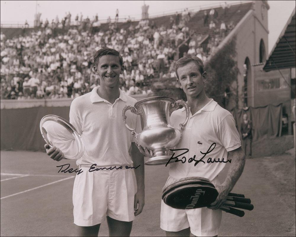 Glossy 10 x 8 photo of Laver and Emerson posing with their respective trophies, signed in black felt tip by both. In fine condition.