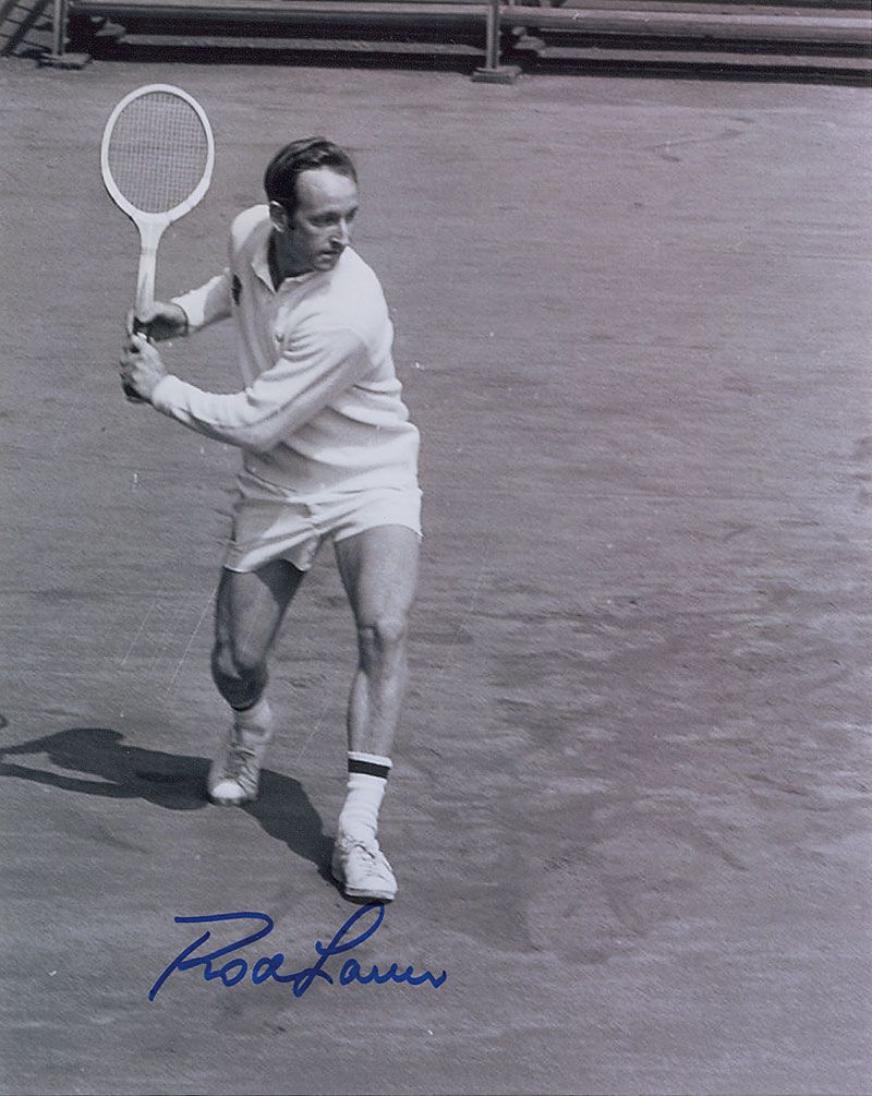 Two satin-finish photos of Laver on the court, one 8 x 10 and one 10 x 8, each signed in blue felt tip. In very fine condition.