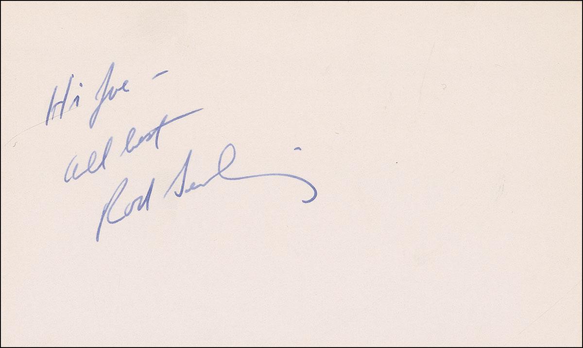 Prolific and highly regarded television writer (1924–1975) best known as creator and host of the television series The Twilight Zone. His big-screen scripts included such classics as Requiem for a Heavyweight (originally written for television) and Planet of the Apes. Vintage ink in-person signature and inscription, “Hi Joe–All best, Rod Serling,” on an off-white 5 x 3 card. In very fine condition.