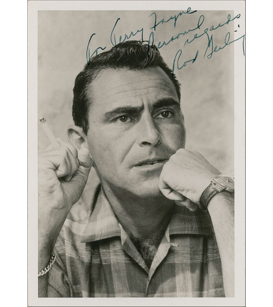Vintage glossy 5 x 7 photo of Serling holding a cigarette, signed and inscribed in black ink “For Terry Fayne, Personal regards, Rod Serling.” Scattered light creases and surface impressions, otherwise fine condition.