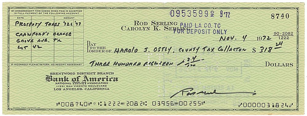 Personal check, 8.25 x 3, filled out and signed by Serling, payable to Harold J. Ostly County Tax Collector for $318.24, November 4, 1972. Memo area notes “Property taxes, Crawford’s Orange Grove Ave. Tr. Lot 42.” In fine condition, with a vertical fold to left side and expected cancellation stamps and holes, with a few holes over a small portion of signature.