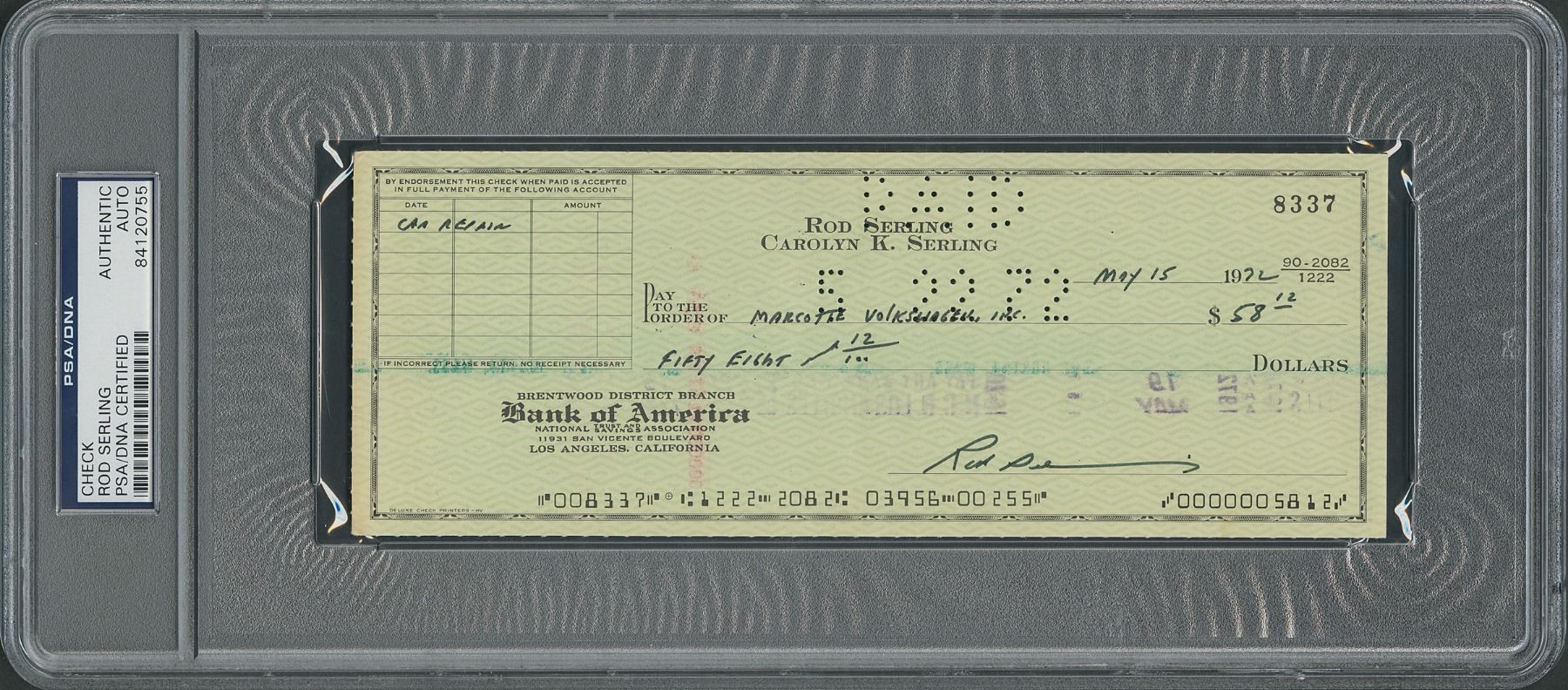 Personal check, 8.25 x 3, filled out and signed by Rod Serling, payable to Marcotte Volkswagen, Inc. for $58.12, May 15, 1972. Memo field reads: "Car repair." In fine condition. Encapsulated in a PSA/DNA authentication holder.