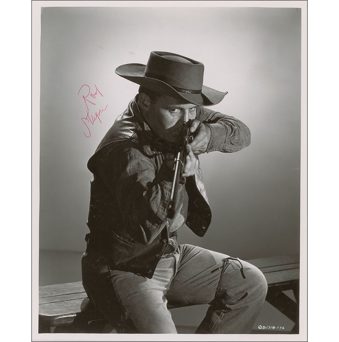 Glossy 8 x 10 publicity photo of Steiger from Jubal, signed in red ballpoint. In fine condition, with scattered creasing, and mild show-through from stamp and caption affixed to the reverse.