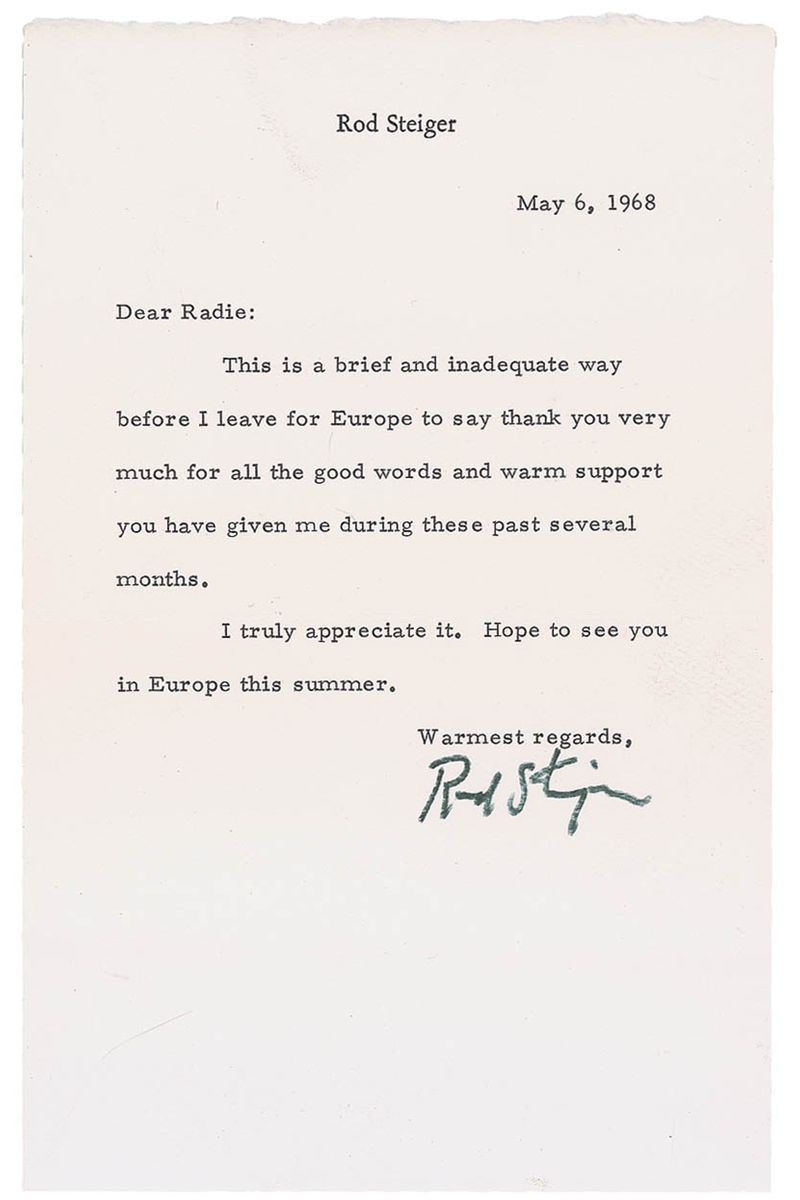TLS, one page, 5.25 x 8.5, personal letterhead, May 6, 1968. Letter to journalist Radie Harris. In part: “Thank you very much for all the good words and warm support you have given me during these past several months.” In fine condition.