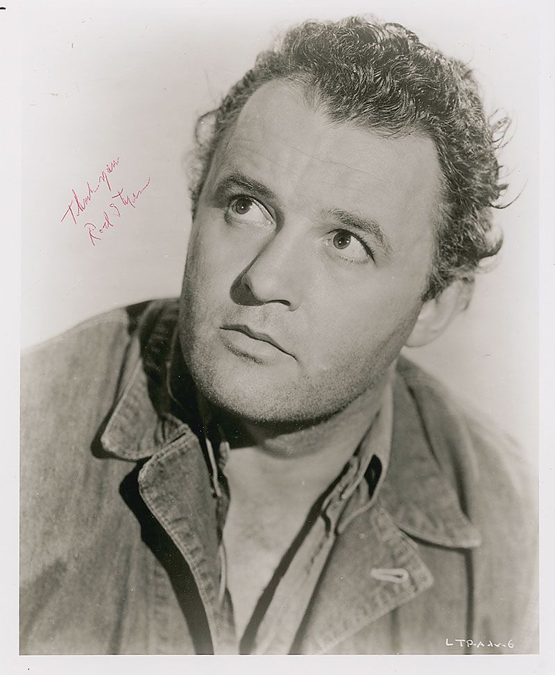 Glossy 8 x 10 photo of Steiger as he appeared in The Unholy Wife, signed in red ballpoint, “Thank you, Rod Steiger.” In fine condition.