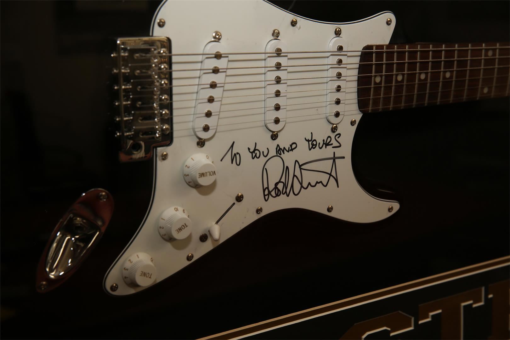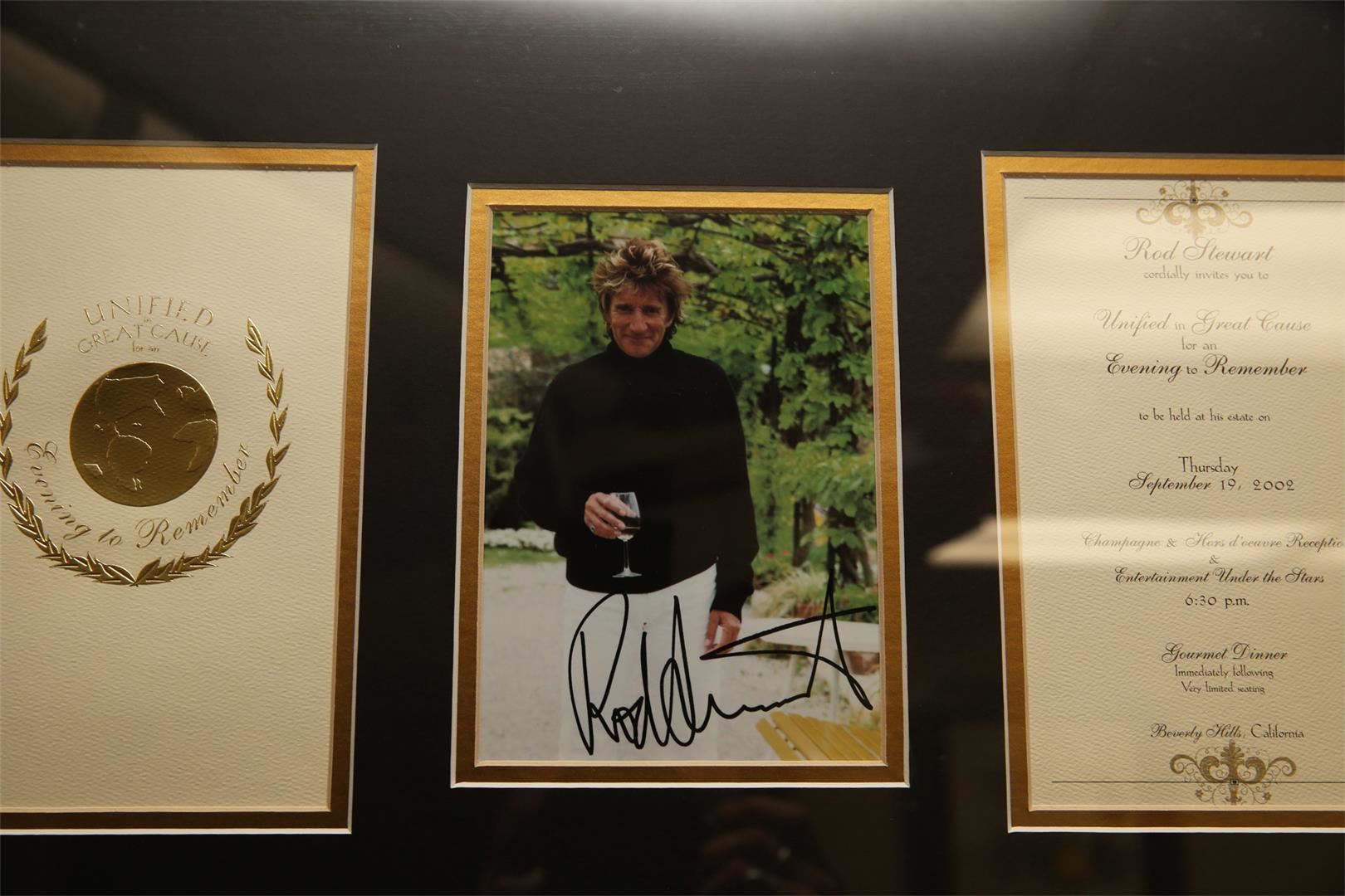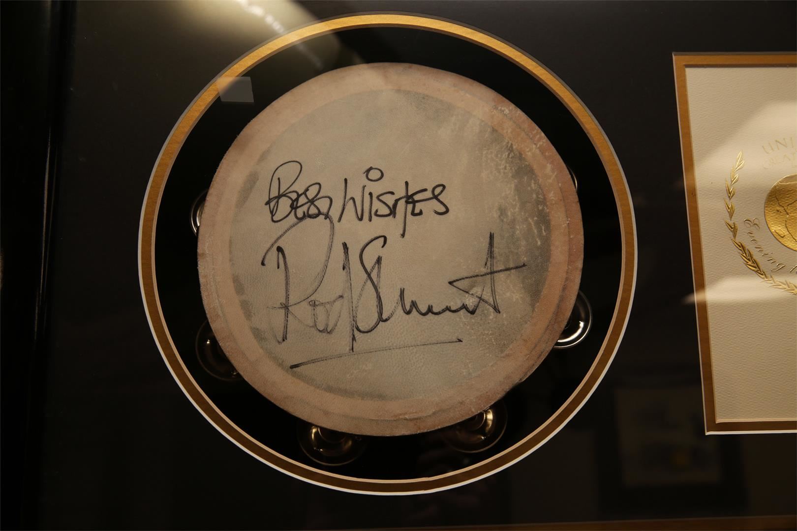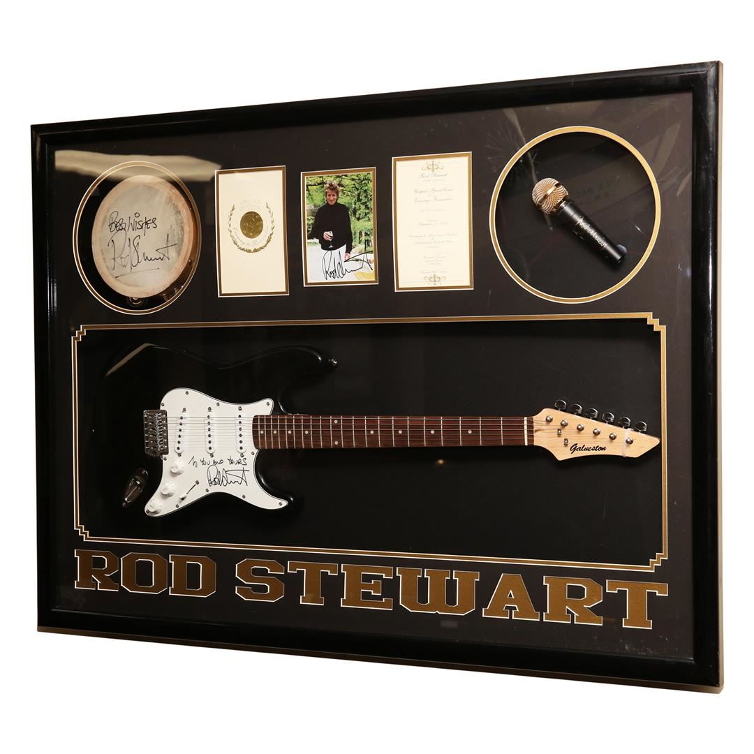 A Rod Stewart autographed Guitar, Tambourine and Microphone Collage. Measures 34" Tall by 46" Wide.
