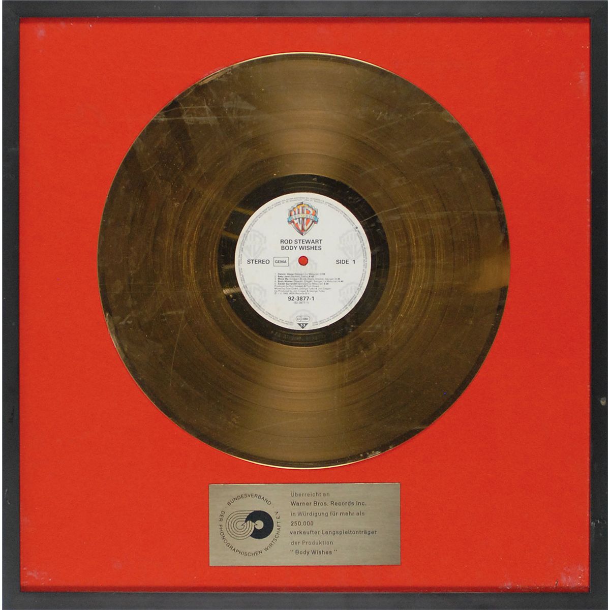 German gold record award for the sale of over 250,000 copies of Stewart’s Body Wishes album. The gold disc is framed with a presentation plaque, in German, to an overall size of 17.5 x 17.5. In fine condition.