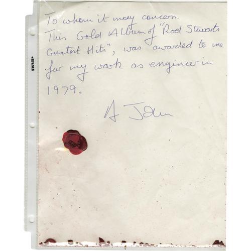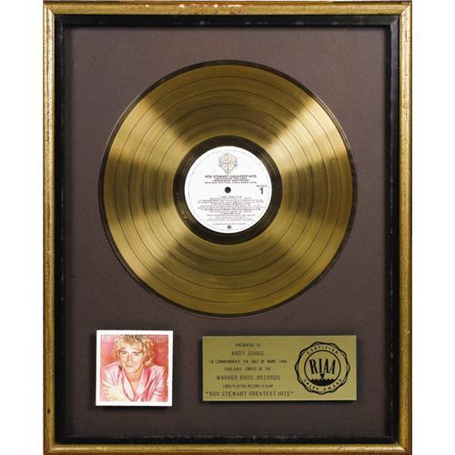 <B>Rod Stewart "Greatest Hits" Gold Record Award (RIAA, 1979).</B></I> Rod "the Mod" Stewart has been a been a fan favorite for years. American audiences were first introduced to Stewart as part of the Jeff Beck Group, and later as front man for good-time rockers the Faces. "Maggie May" was Rod's first big solo hit, beginning a chain of successful pop songs that kept him riding high on the charts throughout the 1970s. This gorgeous Gold Record award, for Rod's "Greatest Hits" LP, was originally presented to engineer Andy Johns. There's some light scuffing to the frame and glass; otherwise, this is in VF condition. The frame size is 17" x 21". Includes a sealed letter of authenticity from Andy Johns.<BR><BR><b>Shipping:</b> Framed - with Glass, Small (<a target="_blank" href="http://www.heritageauctions.com/common/shipping.php">view shipping information</a>)