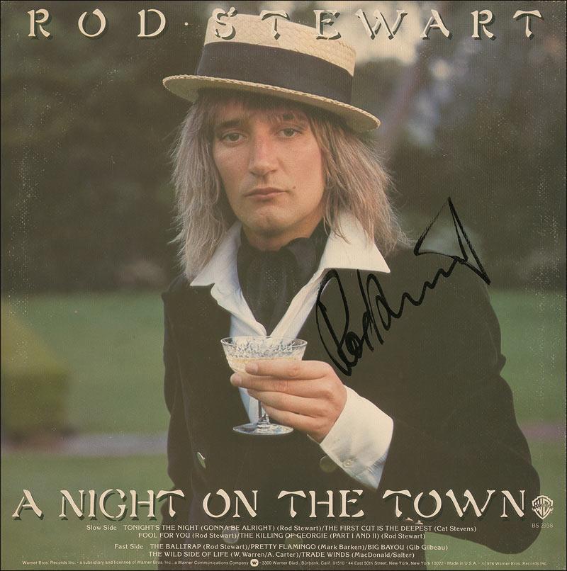A Night on the Town album signed on the back cover in black felt tip “Rod Stewart.” In fine condition, with a few surface impressions and wear. The record is not included.