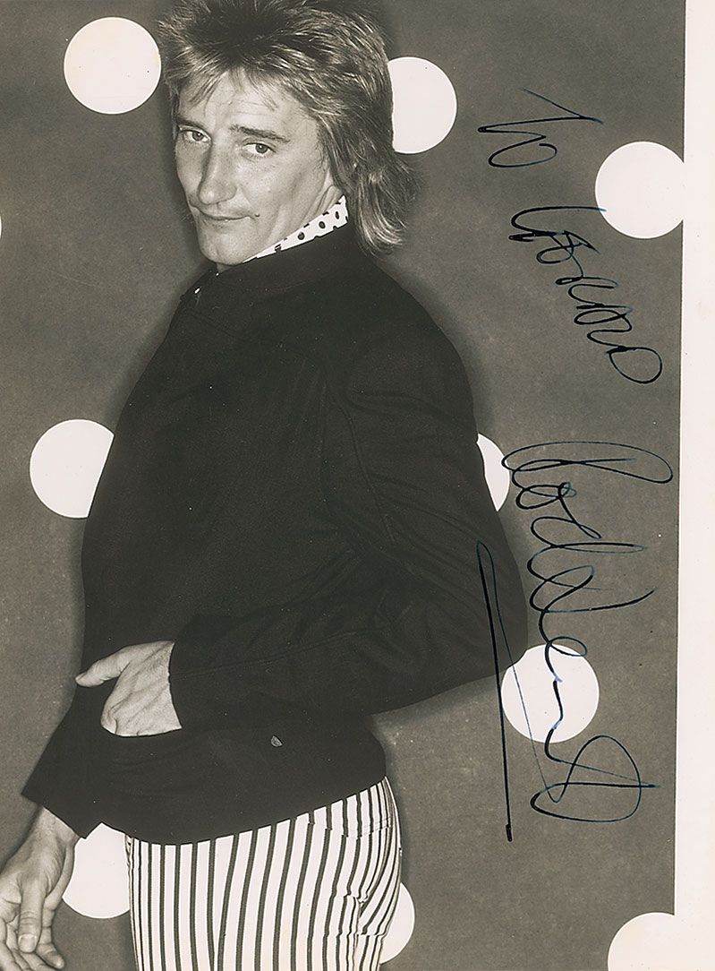Glossy 7.5 x 10 photo of Stewart posing against a polka-dot background, signed and inscribed in fountain pen, “To Gerald, Rod Stewart.” In fine condition.