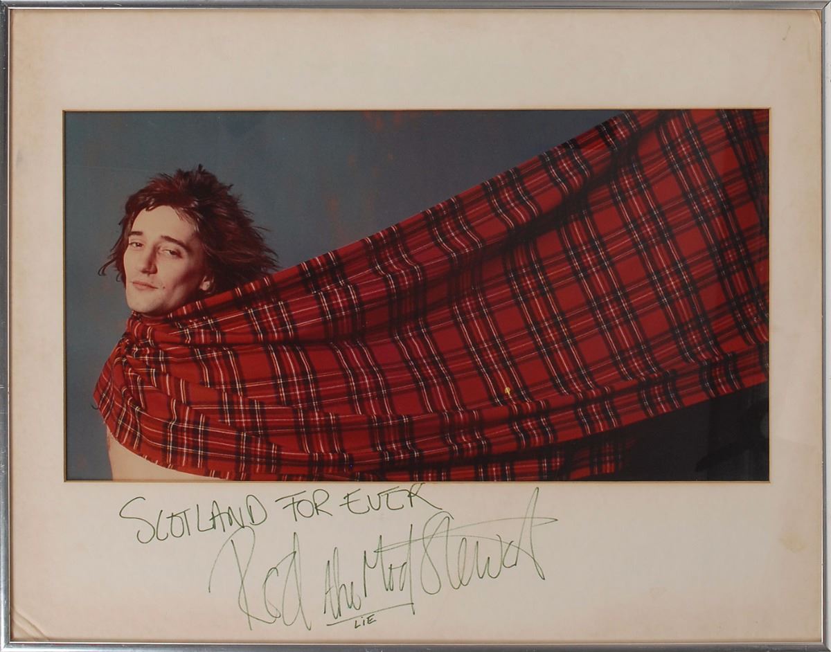 Uncommon color 18.75 x 9.75 paperstock photo of Stewart cloaked in a flowing plaid blanket, matted to an overall size of 21.75 x 16.75, signed on the mat in green felt tip, “Scotland forever, Rod the Mod Stewart,” adding below his sobriquet, “Lie.” Framed and in fine condition, with creasing to the lower left corner of the mat, and scattered overall soiling to the edges of the mat.