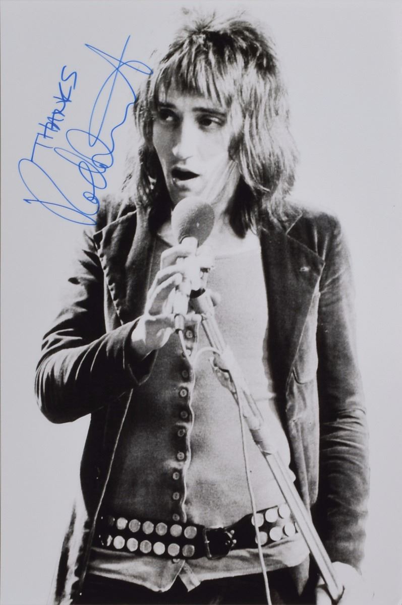 Satin-finish 8 x 12 photo of a young Stewart in a three-quarter-length pose, signed in blue felt tip, "Thanks, Rod Stewart." In fine condition. Pre-certified REAL.
