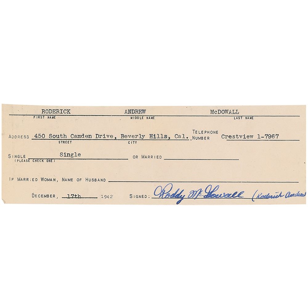 World War II-dated fountain pen signature, "Roddy McDowall (Roderick Andrew)," on an off-white 8.5 x 2.75 sheet clipped from the document listing McDowall"™s personal information, dated December 17, 1942. In fine condition. Despite being only 14 years old when he signed this form, McDowall had already appeared in 15 films, including the 1941 John Ford drama How Green Was My Valley.