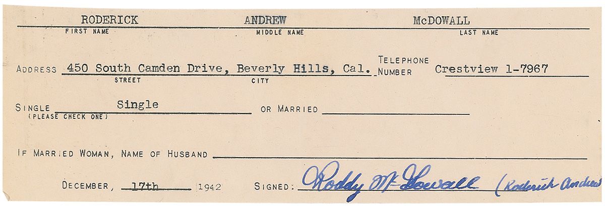 DS, signed “Roddy McDowall (Roderick Andrew),” one page, 8.5 x 2.75, December 17, 1942. An official form with typed personal information, signed when McDowall was just 14 years old. In fine condition, with two vertical folds, one through first name, scattered wrinkling, and trimmed top edge.