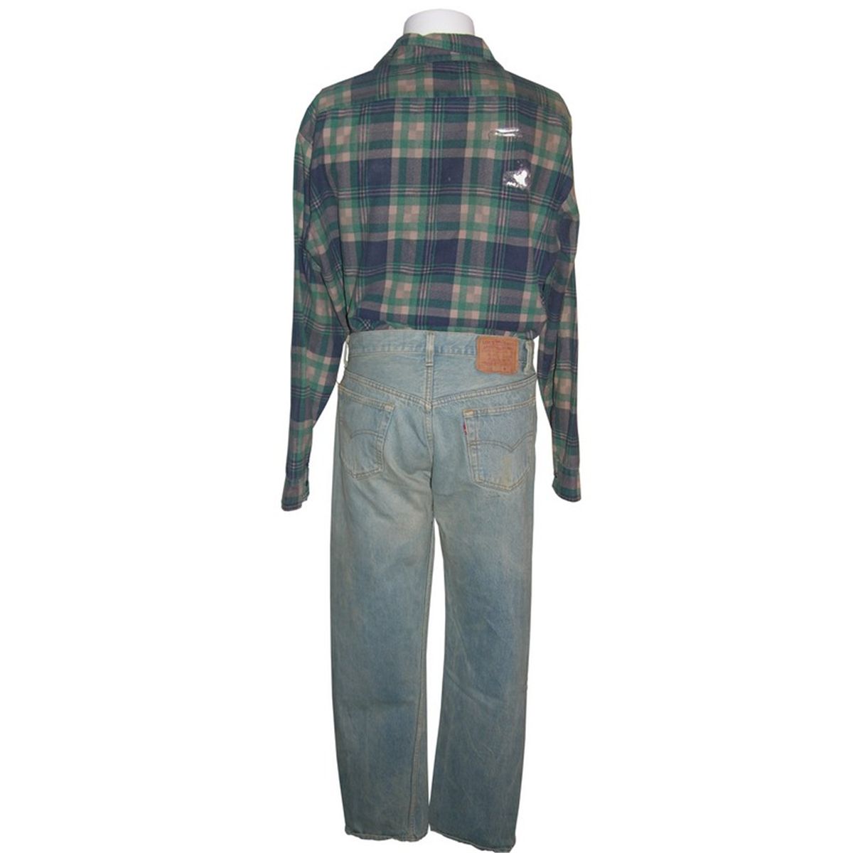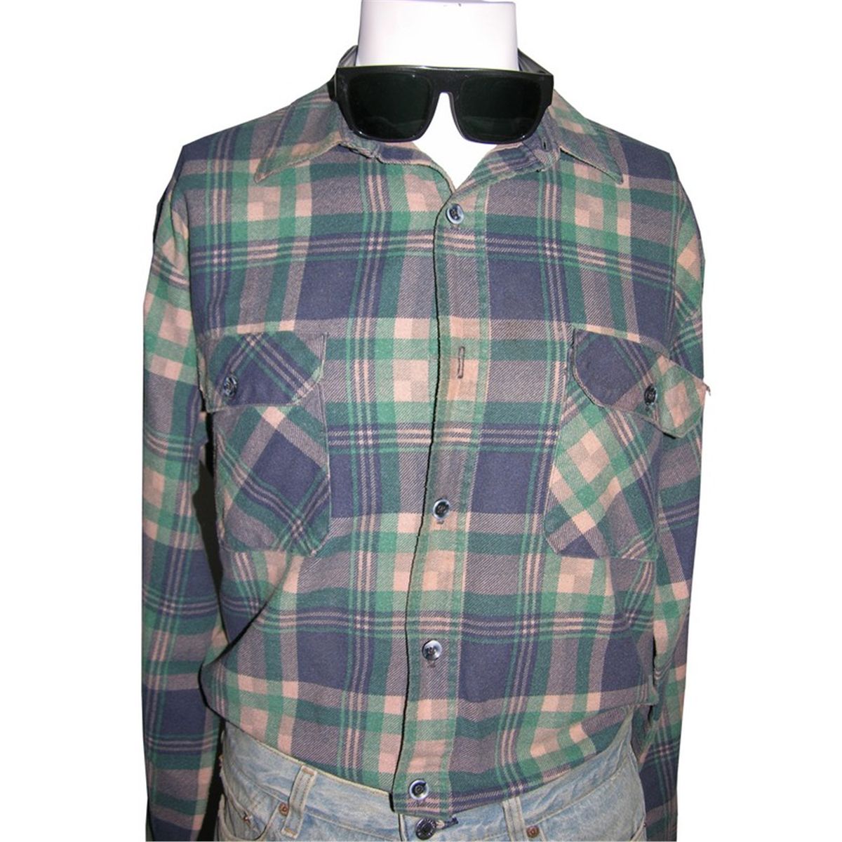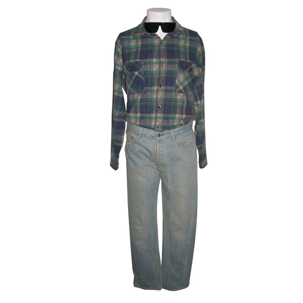 Flannel shirt and faded blue jeans worn by Roddy Piper in the classic sci-fi action film They Live. This is the costume Piper wears in the film's famous fight scene, wherein Piper challenges an opponent to "put on the glasses". This lot further includes a pair of sunglasses which are not screen used or part of the production but are included so as to complete the ensemble. A certificate of authenticity is included.