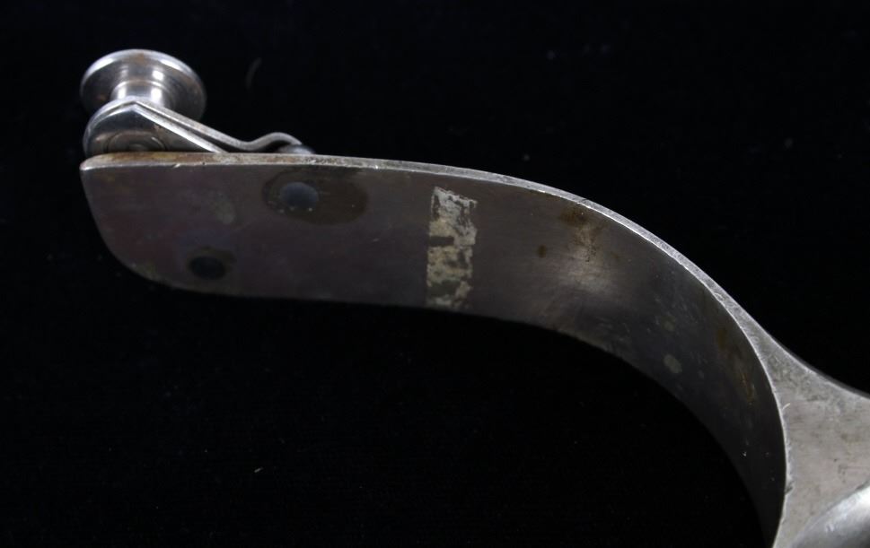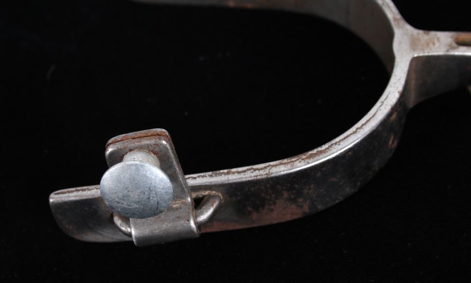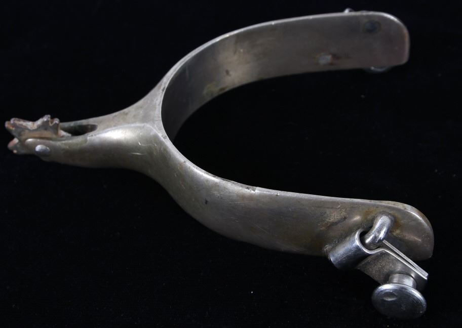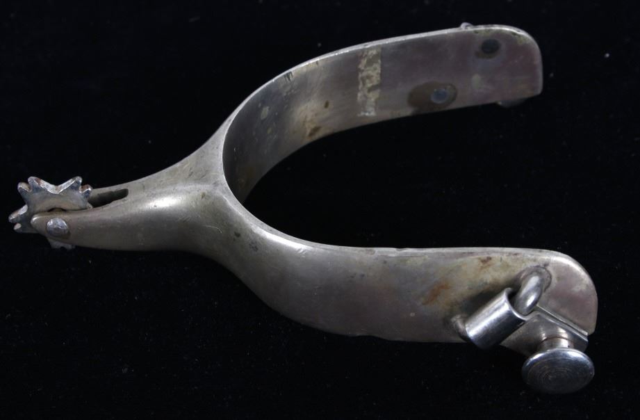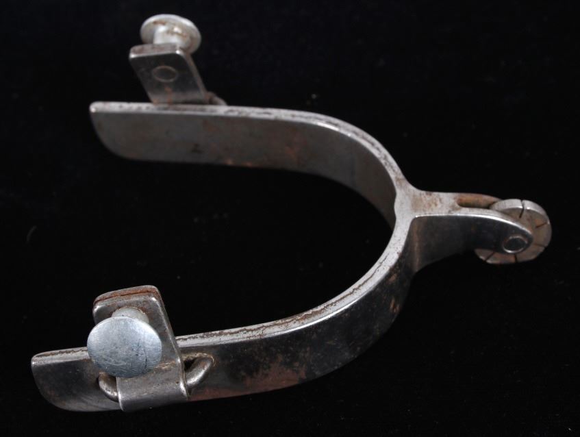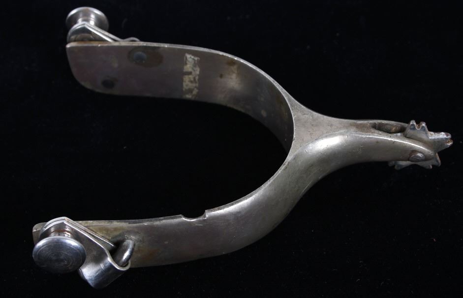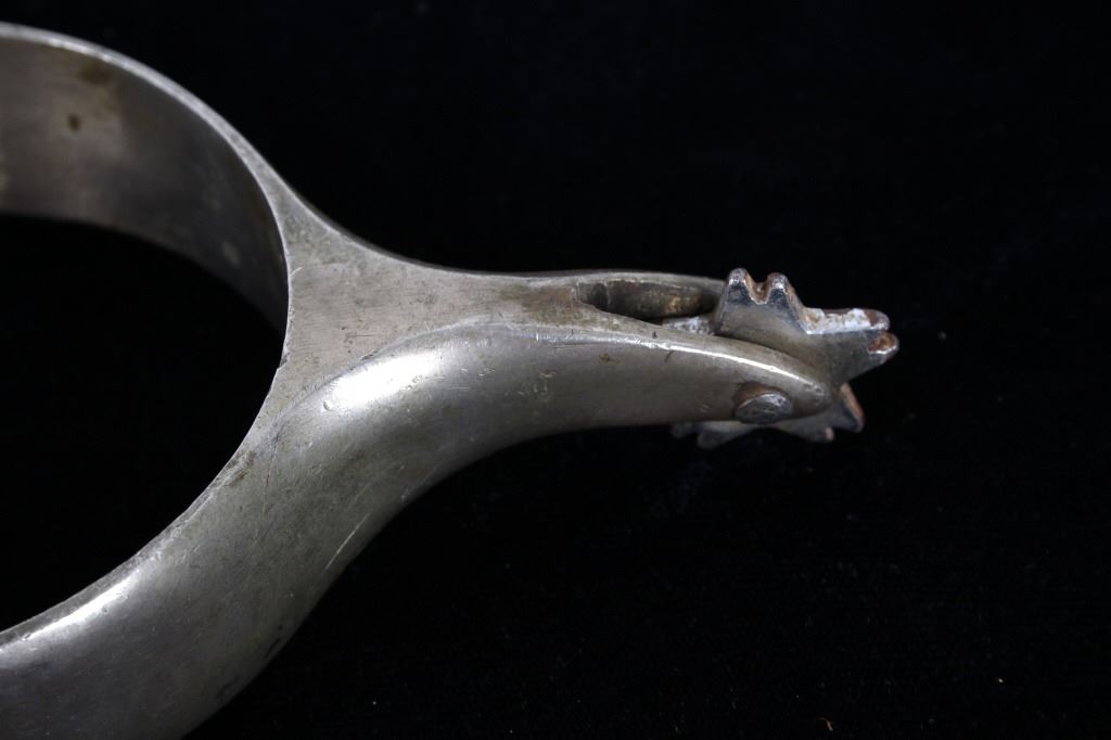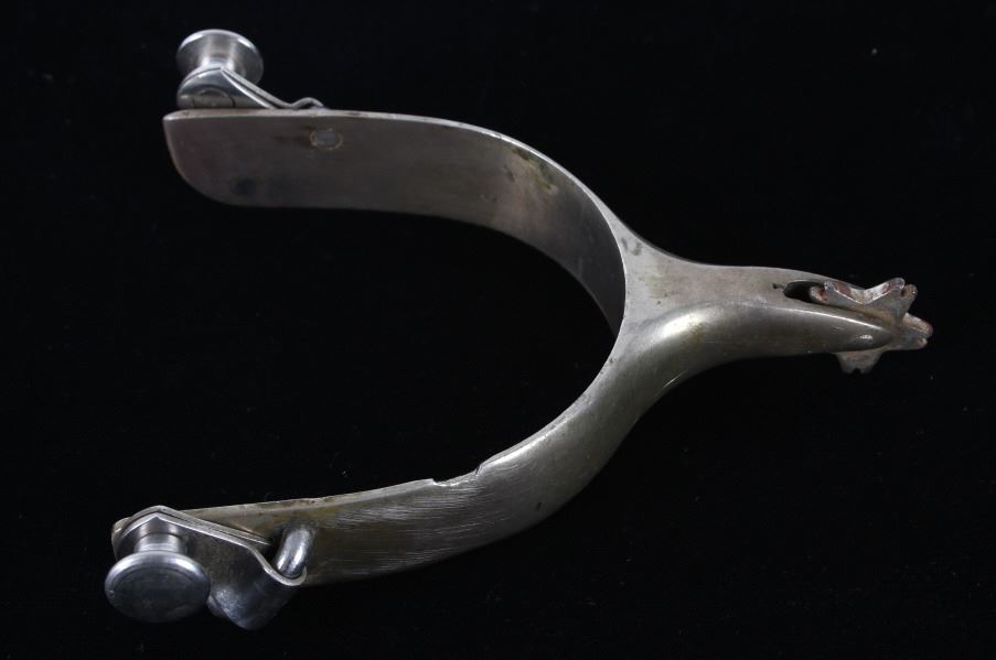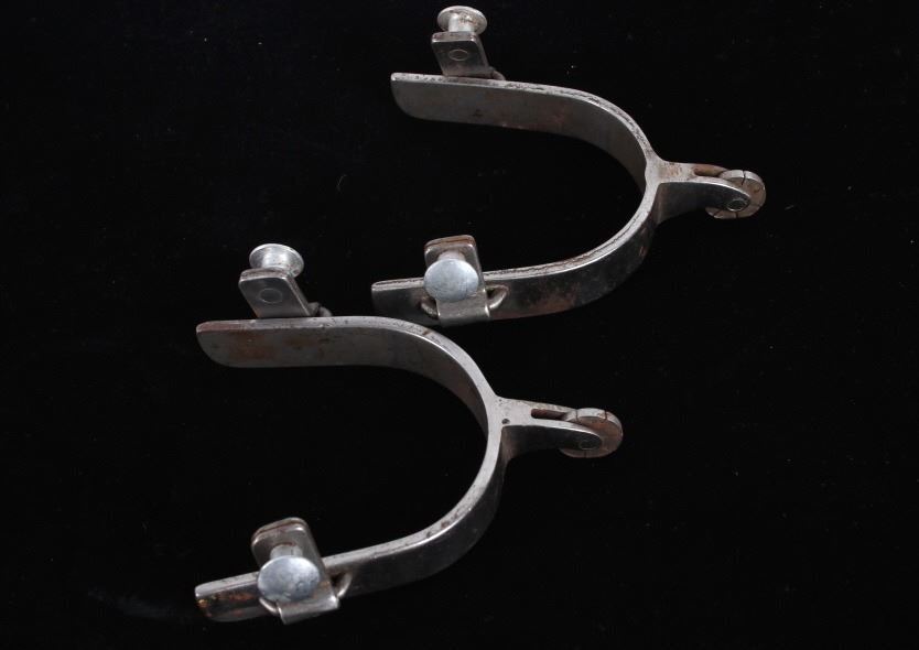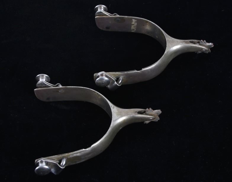 Featured in this lot is this rodeo bull riding and barrel racing spur collection. There are two spurs in this collection. The first is a pair of nickel bull riding spurs with swivel spur strap buttons and a five tine bull riding star rowel with a single piece frame and are marked E-M on the inside of the spur frame. The second pair is a stainless steel pair of barrel racing spurs with a rounded spur rowel with swivel spur strap buttons and a single piece spur frame. The condition of this collection of rodeo spurs is good with a couple of dings to the bull riding spurs but otherwise is in good overall condition. The measurements of these spurs are 1 1/4" x 5 1/4" x 4 1/2" and for the second pair 1 1/2" x 4 1/2" x 4 1/4".