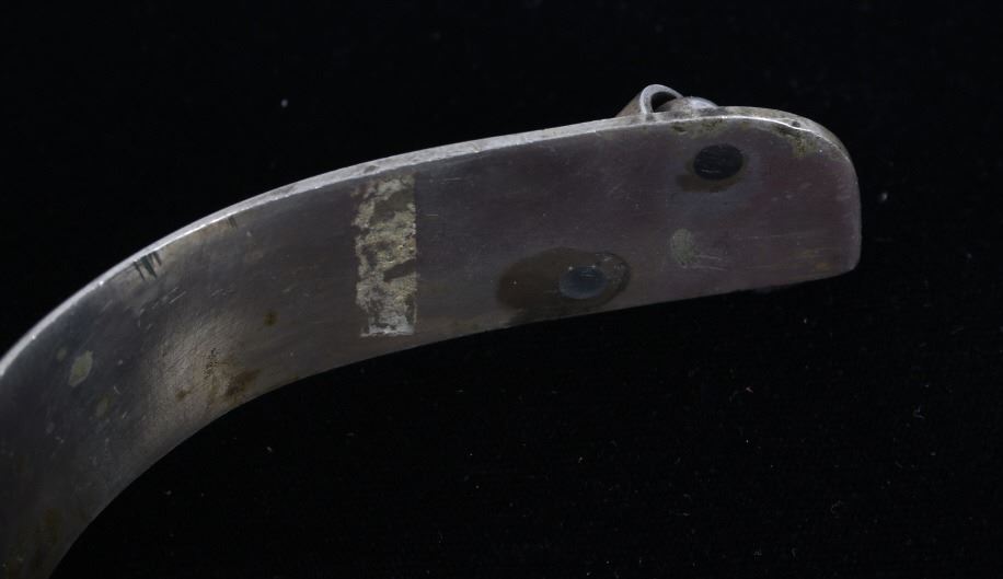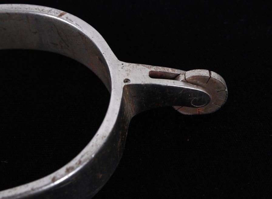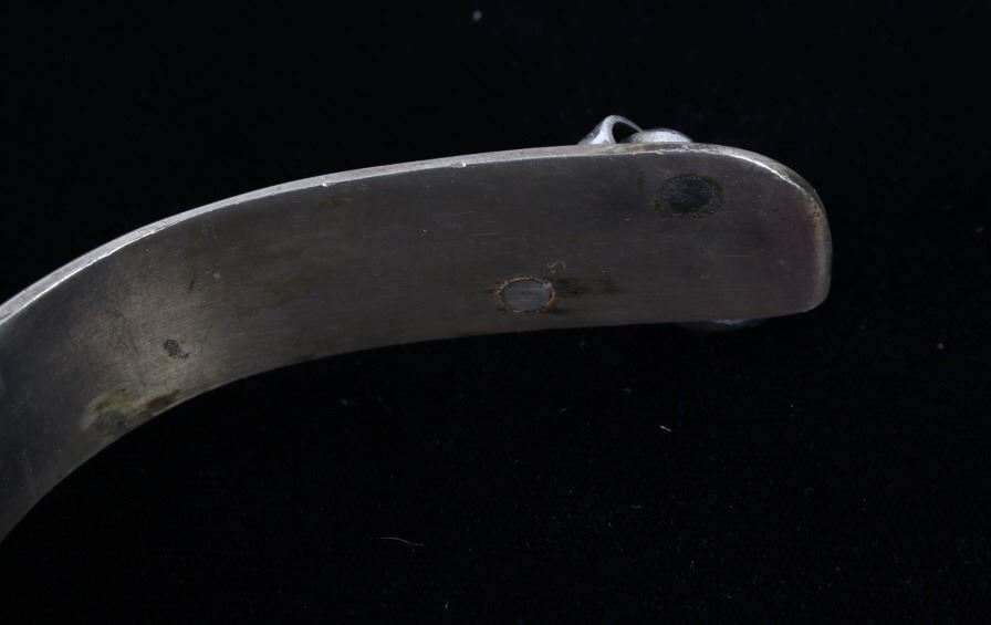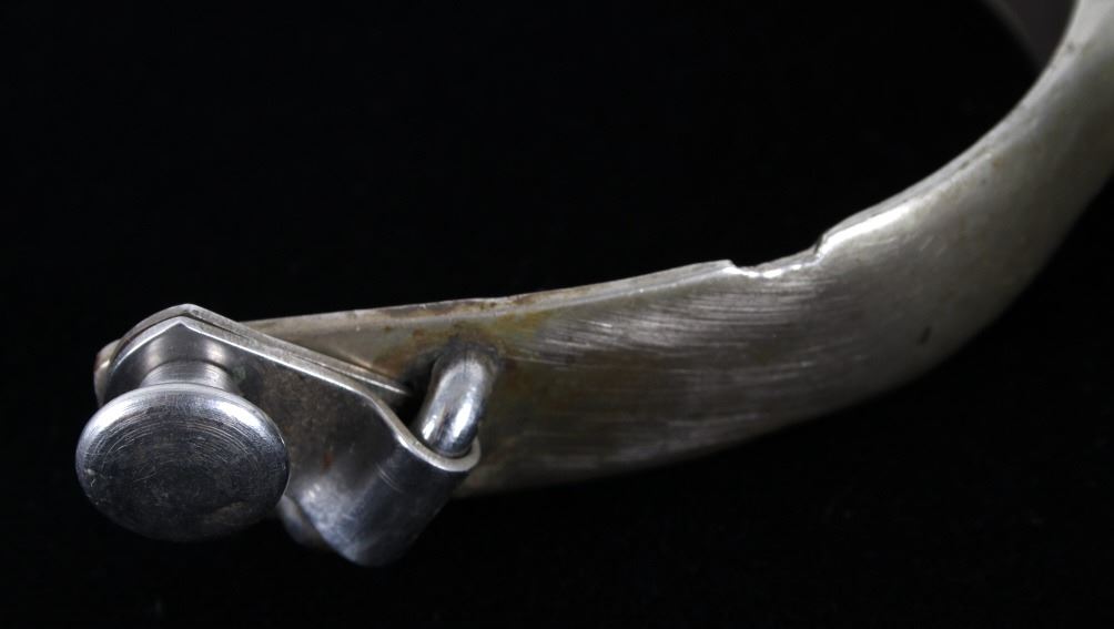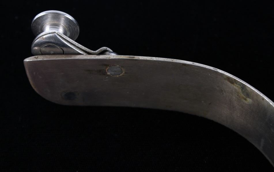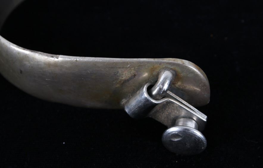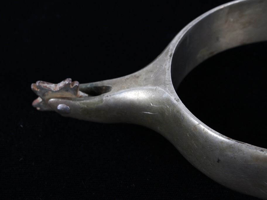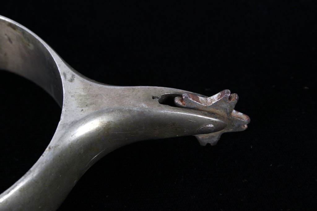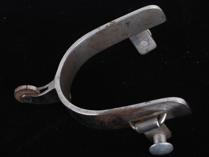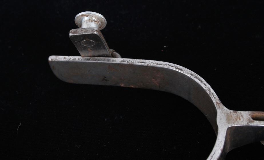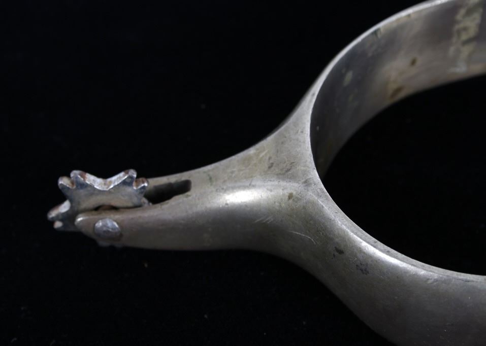 Featured in this lot is this rodeo bull riding and barrel racing spur collection. There are two spurs in this collection. The first is a pair of nickel bull riding spurs with swivel spur strap buttons and a five tine bull riding star rowel with a single piece frame and are marked E-M on the inside of the spur frame. The second pair is a stainless steel pair of barrel racing spurs with a rounded spur rowel with swivel spur strap buttons and a single piece spur frame. The condition of this collection of rodeo spurs is good with a couple of dings to the bull riding spurs but otherwise is in good overall condition. The measurements of these spurs are 1 1/4" x 5 1/4" x 4 1/2" and for the second pair 1 1/2" x 4 1/2" x 4 1/4".