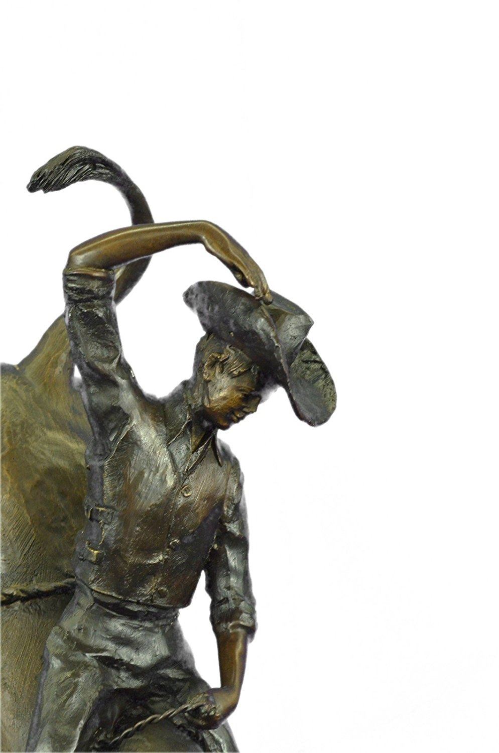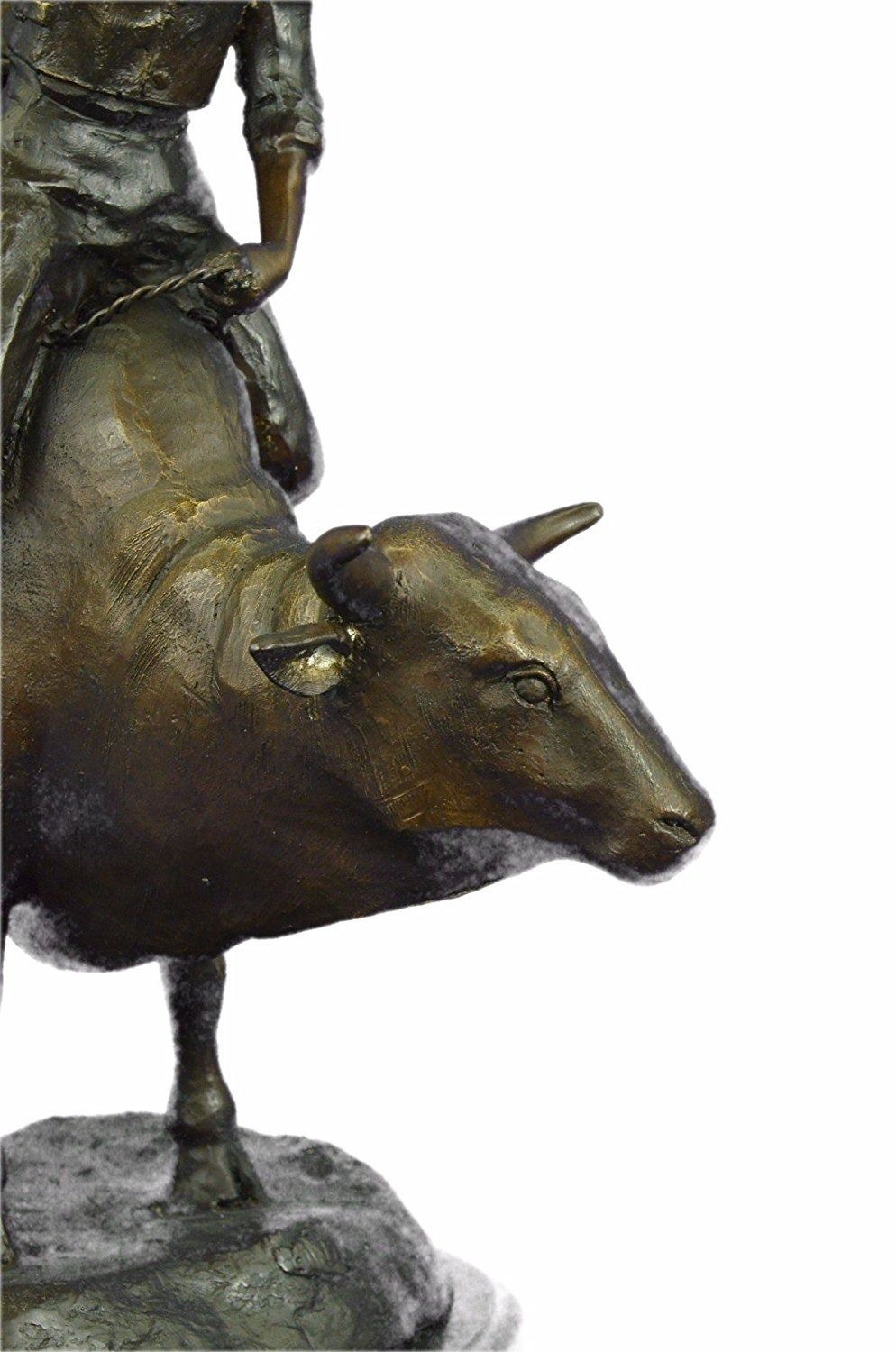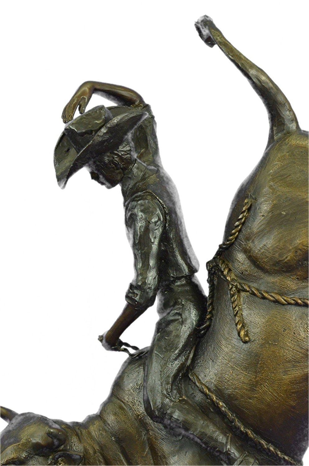 A seasoned cowboy courageously rides a bucking bull in the center of the rodeo. The bull leaps, kicks and twist, raising the cowboy high off the ground but his grip on the reins never break.He hold his hat to his head with his free hand his free hand but doesn't lose his balance. He is dressed in a shirt,chaps and boots. It is a battle of the wills, but either way this cowboy is not giving up. 100% bronze and handmade, this twotone brown patina sculpture was cast using the Lost Wax Method and mounted on a black marble base and is signed Frederic Remington Bronze Dimensions with Marble Base: Height 24 x Width 19 Marble Dimensions:Diameter 12 Height without base: 23 Weight: 30 LBS Inventory 7257492M15027