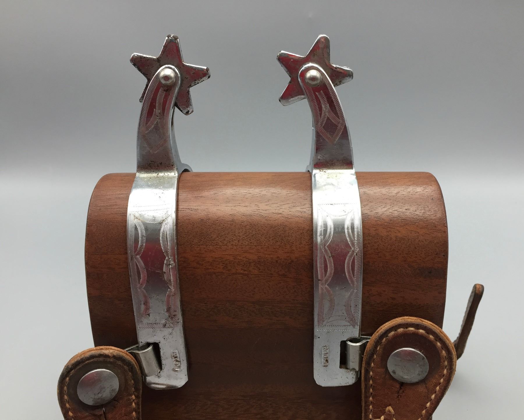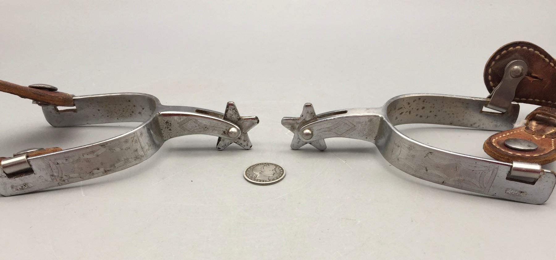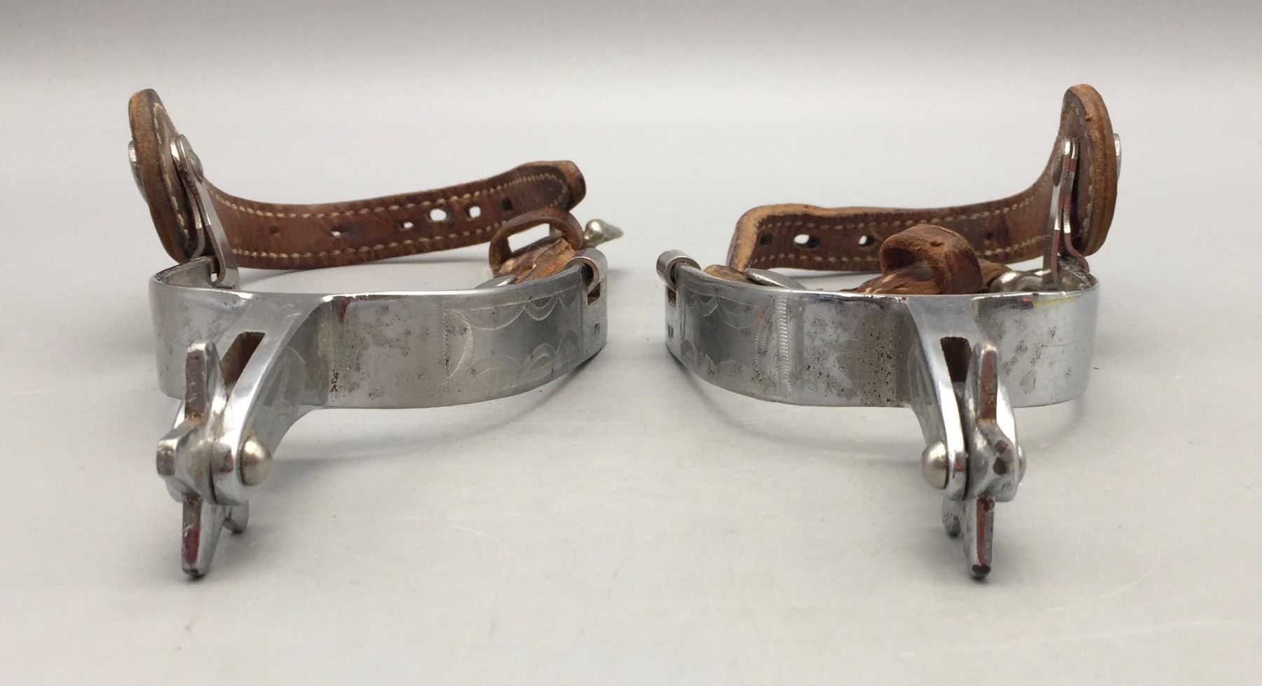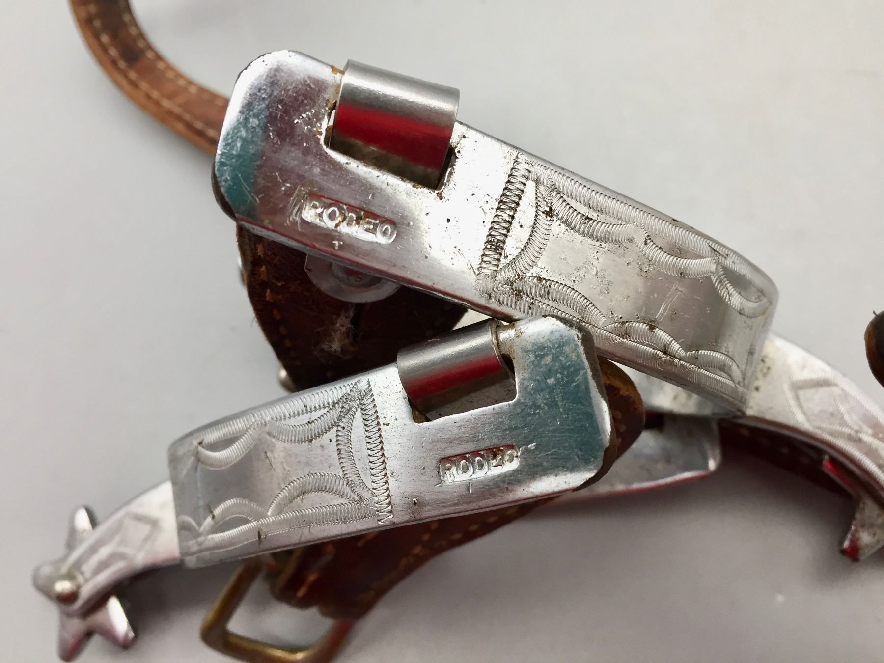 Description: Presented for sale in this lot are a pair of engraved “rodeo” spurs with simple brown leather strap. Maker: Kelly made these “Rodeo” brand spurs. Approx. Age: Vintage. Size: 3” heel, 2-1/4” shank, 3/4” band. Condition: Good for their age, normal wear expected. Please look closely at the pictures - they are an important part of our description. Shipping: There will be a $5 handling / packaging fee for shipping this lot. The actual cost of postage will be added on top of that.