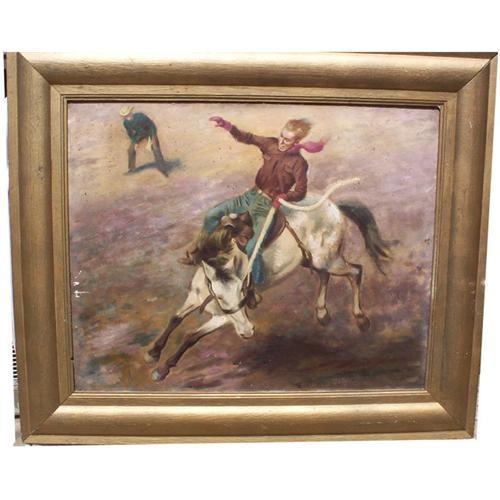 Great western scene. It is on board. The size with the frame is 26 X 21.5. The paint is scraped in a small area on the left and there is a small puncture in the board to the right of the horses tail. (see photos) The artist signature is hard to read- it looks like Sch..ichan? The frame is in pretty good shape. We are uncertain of the origin date.