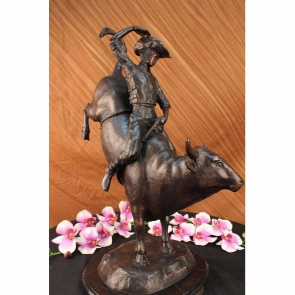 to his head with his free hand his free hand but doesn't lose his balance. He is dressed in a Shirt, Chaps and boots. It is a battle of the wills, but either way this cowboy is not giving up. This two tone brown patina sculpture was cast using the lost wax method and mounted on a black marble base. Bronze dimensions with marble base: Height 24 X Width 19 inches. Weight: 30 lbs.