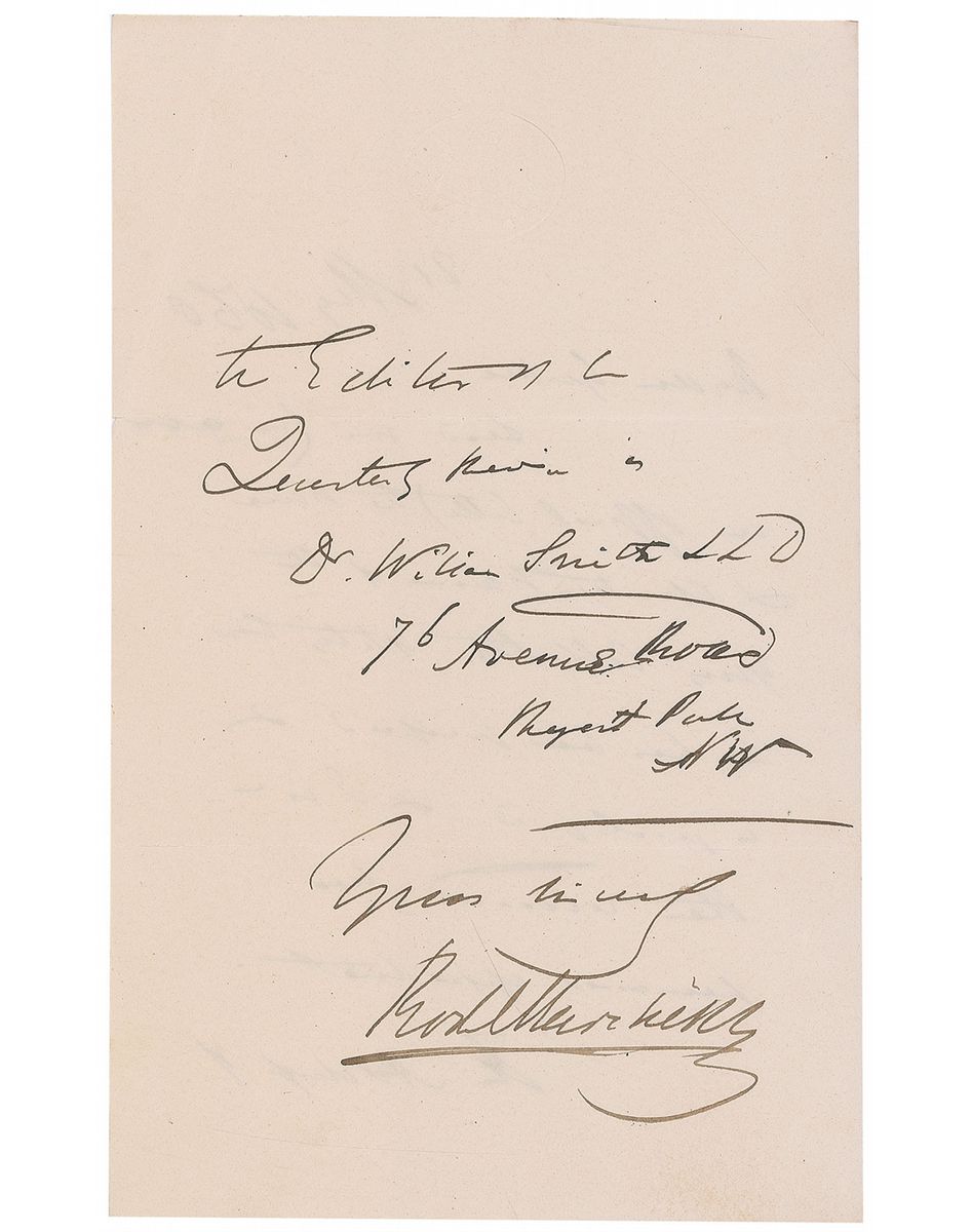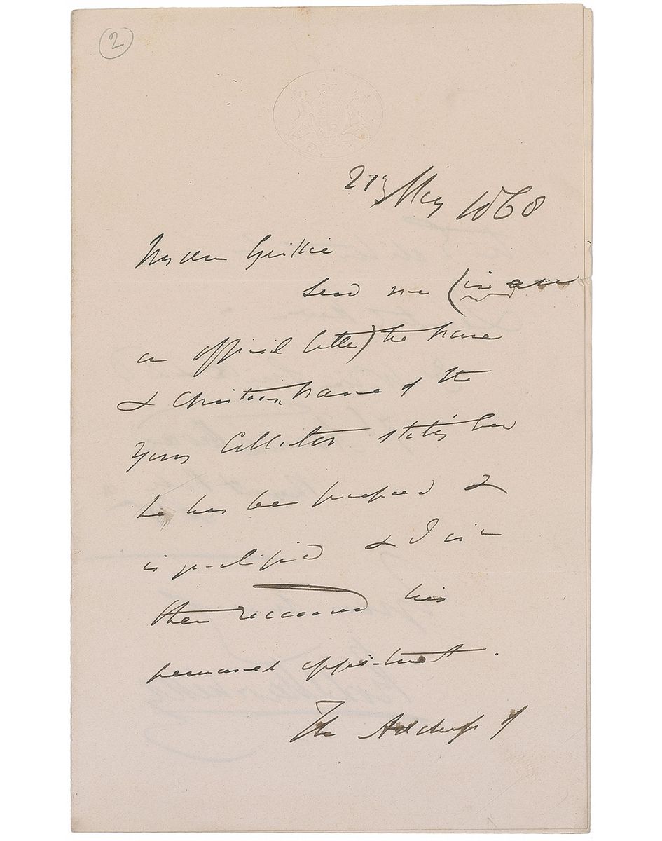 Scottish geologist (1792–1871) who was the first to investigate the Silurian system. ALS, one page both sides, 4.5 x 7, May 21, 1868. Letter to an associate requesting something to be sent “(in an official letter).” In fine condition, with a few light creases and wrinkles.